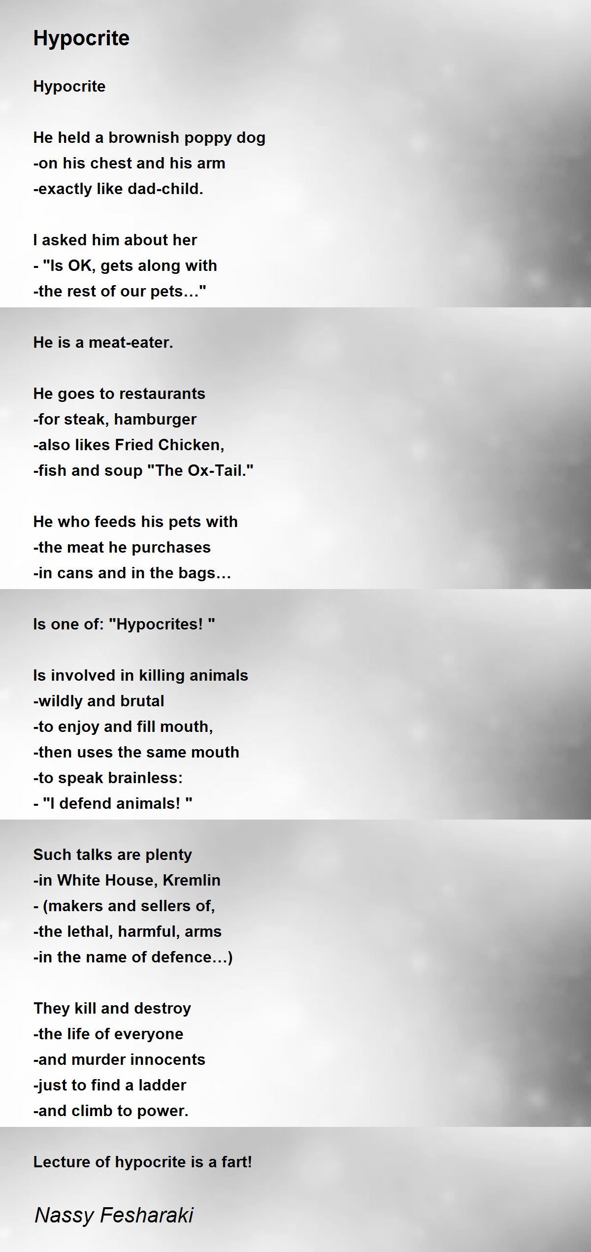 Hi, Nassy. You've drawn a fine parallel between two hypocrisies, and the last line is an amusing surprise. Enjoyed.
