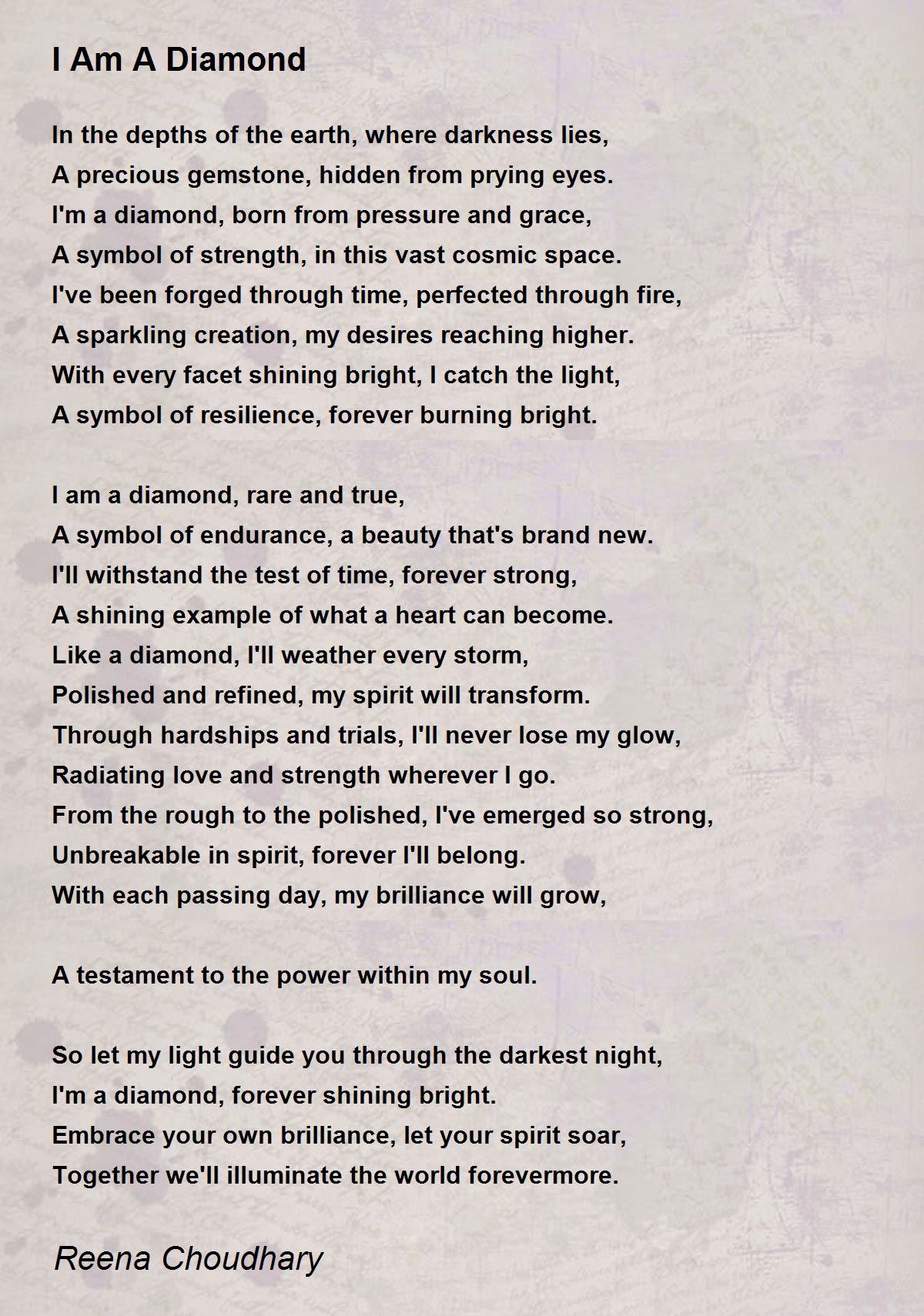 It's a rare poem from a new poet, I loved the theme. Loved these lines, 'I am a diamond, rare and true, A symbol of endurance, a beauty that's brand new. I'll withstand the test of time, forever strong, A shining example of what a heart can become. Like a diamond, I'll weather every storm, '
