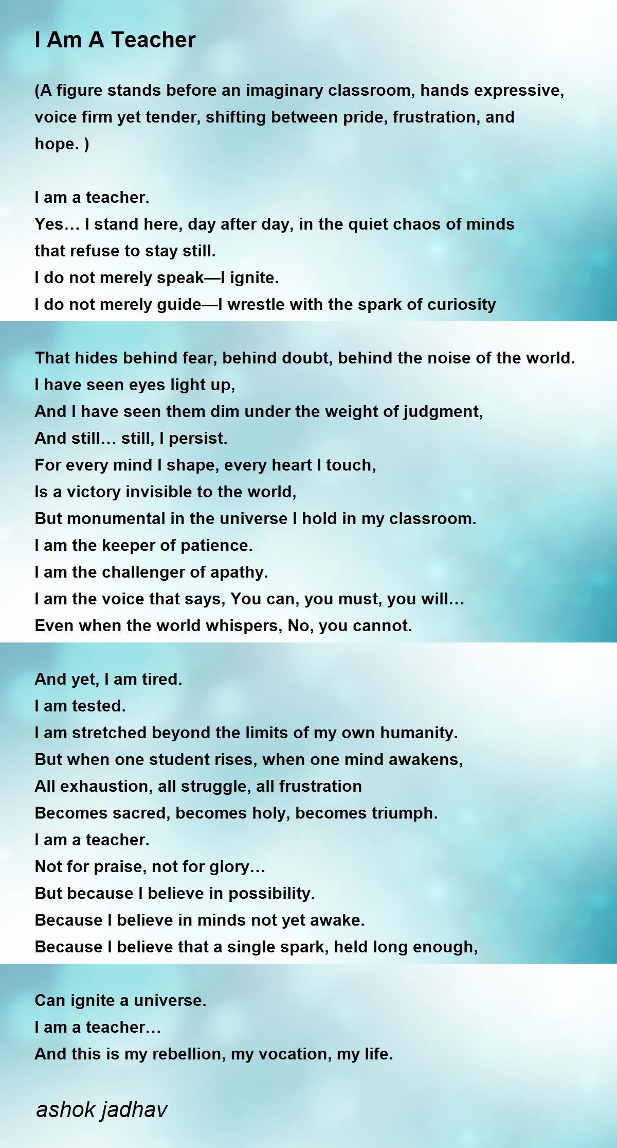 (A figure stands before an imaginary classroom, hands expressive, voice firm yet tender, shifting between pride, frustration, and hope.)
