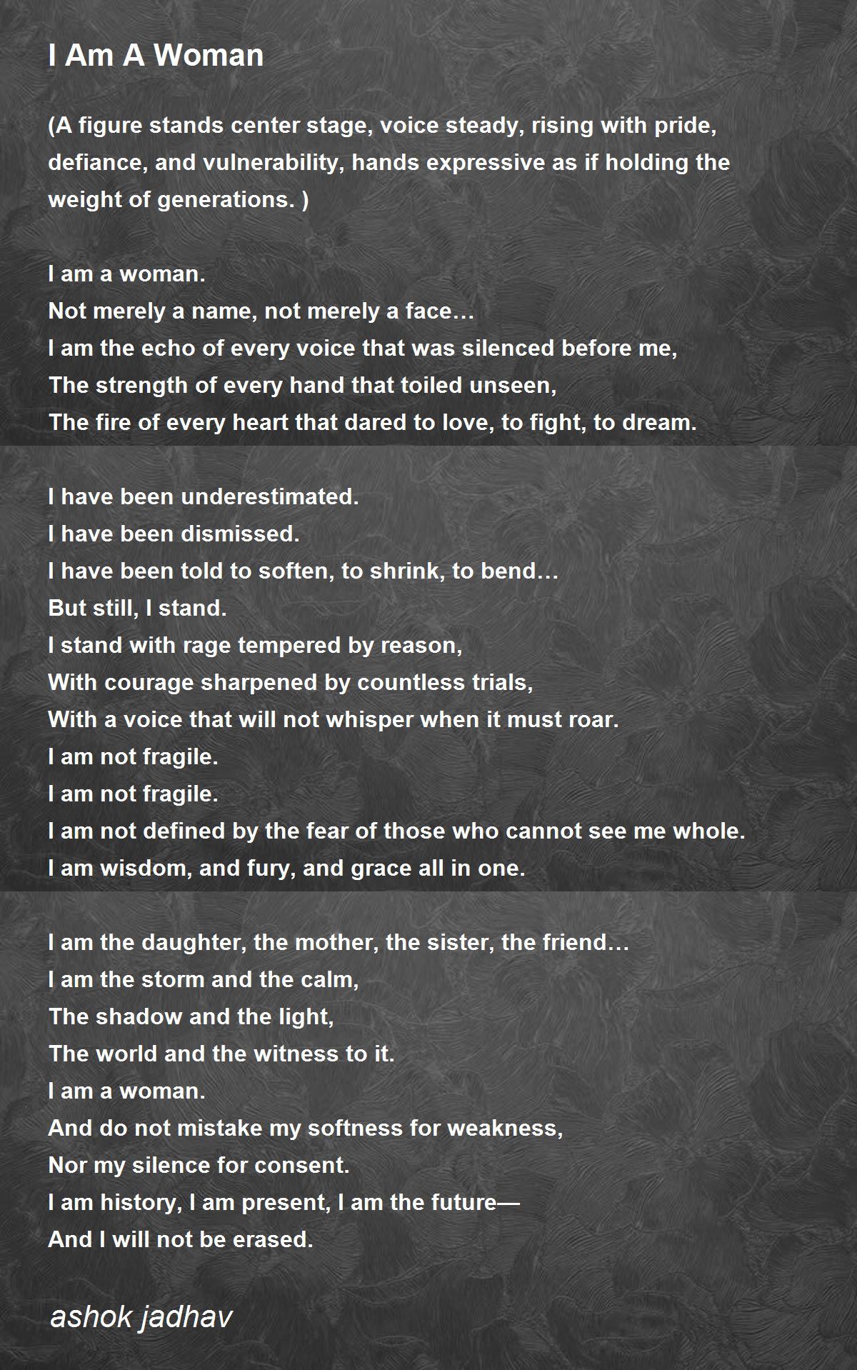 (A figure stands center stage, voice steady, rising with pride, defiance, and vulnerability, hands expressive as if holding the weight of generations.)
