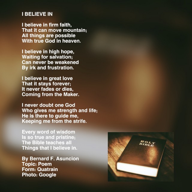 I believe in great love That it stays forever; It never fades or dies, Coming from the Maker. I never doubt one God Who gives me strength and life; He is there to guide me, Keeping me from the strife..........///it's beautiful poem penned and I like this two stanzas very much///