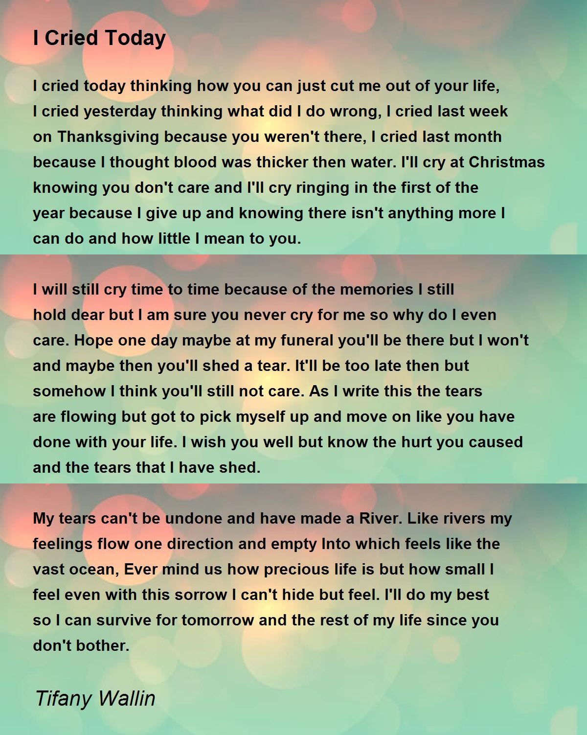 I will still cry time to time because of the memories I still hold dear but I am sure you never cry for me so why do I even care. Hope one day maybe at my funeral you'll be there but I won't and maybe then you'll shed a tear. It'll be too late then but somehow I think you'll still not care.As I write this the tears are flowing but got to pick myself up and move on like you have done with your life. I wish you well but know the hurt you caused and the tears that I have shed.