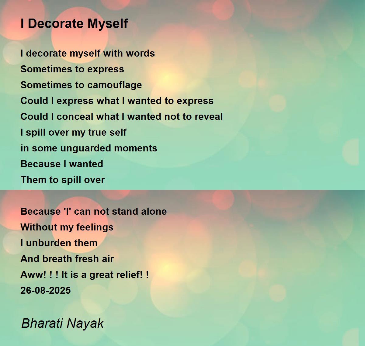 A wonderful poem so heartfelt. It resonates to many of us if not all. There are words that lurk in our hearts and in the recesses of our minds that need to be spilled out to lessen our baggage in this journey of life.