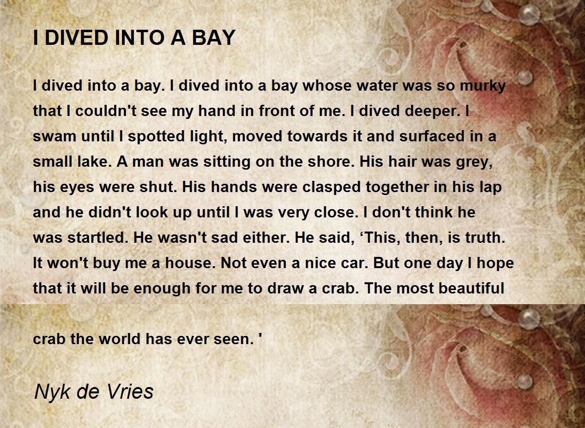I dived into a bay. I dived into a bay whose water was so murky that I couldn't see my hand in front of me. I dived deeper. I swam until I spotted light, moved towards it and surfaced in a small lake. A man was sitting on the shore. His hair was grey, his eyes were shut. His hands were clasped together in his lap and he didn't look up until I was very close. I don't think he was startled. He wasn't sad either. He said, ‘This, then, is truth. It won't buy me a house. Not even a nice car. But one day I hope that it will be enough for me to draw a crab. The most beautiful crab the world has ever seen.'