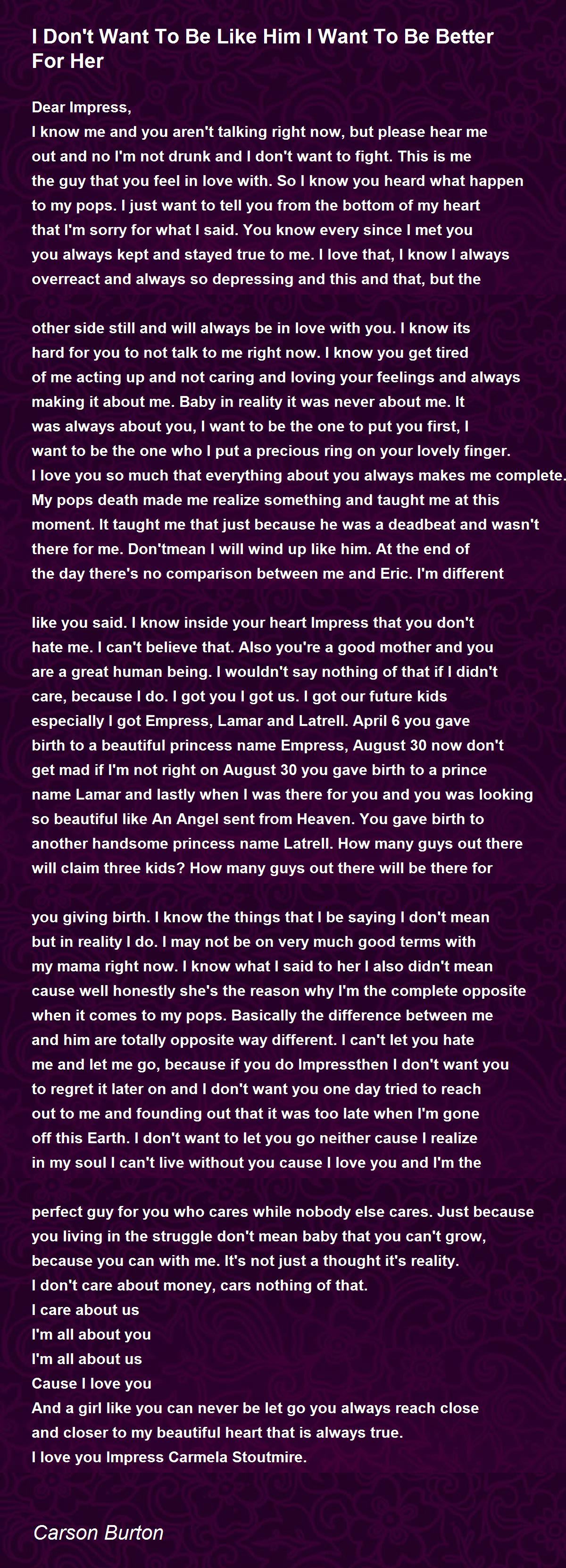 I know me and you aren't talking right now, but please hear me out and no I'm not drunk and I don't want to fight. This is me the guy that you feel in love with. So I know you heard what happen to my pops. I just want to tell you from the bottom of my heart that I'm sorry for what I said. You know every since I met you you always kept and stayed true to me. I love that, I know I always overreact and always so depressing and this and that, but the other side still and will always be in love with you. I know its hard for you to not talk to me right now. I know you get tired of me acting up and not caring and loving your feelings and always making it about me. Baby in reality it was never about me. It was always about you, I want to be the one to put you first, I want to be the one who I put a precious ring on your lovely finger. I love you so much that everything about you always makes me complete. My pops death made me realize something and taught me at this moment. It taught me that just because he was a deadbeat and wasn't there for me. Don'tmean I will wind up like him.At the end of the day there's no comparison between me and Eric. I'm different like you said. I know inside your heart Impress that you don't hate me. I can't believe that. Also you're a good mother and you are a great human being. I wouldn't say nothing of that if I didn't care, because I do. I got you I got us. I got our future kids especially I got Empress, Lamar and Latrell. April 6 you gave birth to a beautiful princess name Empress, August 30 now don't get mad if I'm not right on August 30 you gave birth to a prince name Lamar and lastly when I was there for you and you was looking so beautiful like An Angel sent from Heaven. You gave birth to another handsome princess name Latrell. How many guys out there will claim three kids? How many guys out there will be there for you giving birth. I know the things that I be saying I don't mean but in reality I do. I may not be on very much good terms with my mama right now. I know what I said to her I also didn't mean cause well honestly she's the reason why I'm the complete opposite when it comes to my pops. Basically the difference between me and him are totally opposite way different. I can't let you hate me and let me go, because if you do Impressthen I don't want you to regret it later on and I don't want you one day tried to reach out to me and founding out that it was too late when I'm gone off this Earth. I don't want to let you go neither cause I realize in my soul I can't live without you cause I love you and I'm the perfect guy for you who cares while nobody else cares. Just because you living in the struggle don't mean baby that you can't grow, because you can with me. It's not just a thought it's reality. I don't care about money, cars nothing of that.