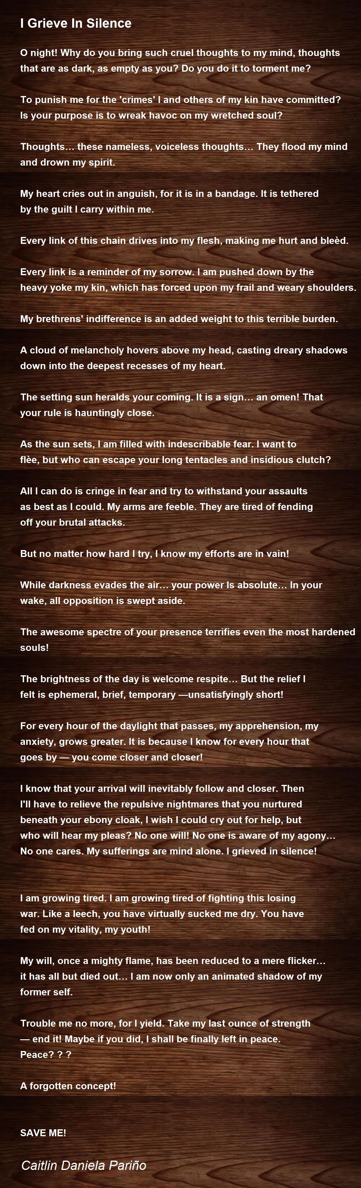 I know that your arrival will inevitably follow and closer. Then I'll have to relieve the repulsive nightmares that you nurtured beneath your ebony cloak, I wish I could cry out for help, but who will hear my pleas? No one will! No one is aware of my agony… No one cares. My sufferings are mind alone. I grieved in silence!