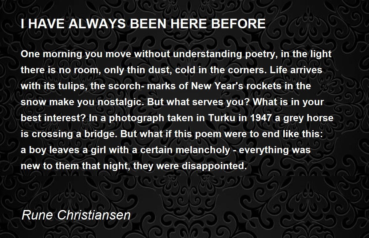One morning you move without understanding poetry, in the light there is no room, only thin dust, cold in the corners. Life arrives with its tulips, the scorch-marks of New Year's rockets in the snow make you nostalgic. But what serves you? What is in your best interest? In a photograph taken in Turku in 1947 a grey horse is crossing a bridge. But what if this poem were to end like this: a boy leaves a girl with a certain melancholy - everything was new to them that night, they were disappointed.