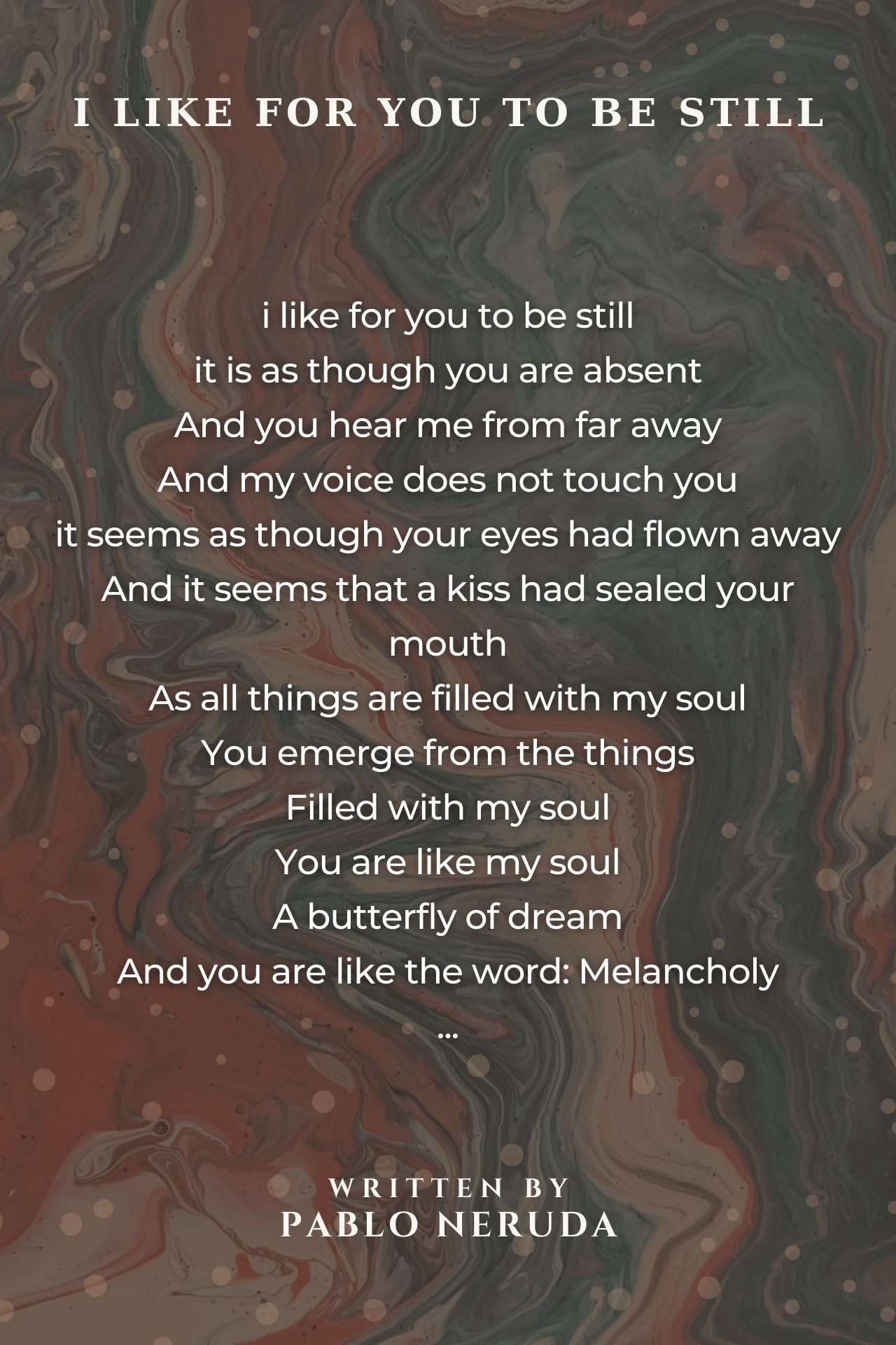 i like for you to be still it is as though you are absent Distant and full of sorrow So you would've died One word then, One smile is enough And i'm happy; Happy that it's not true. Great poem of Neruda.