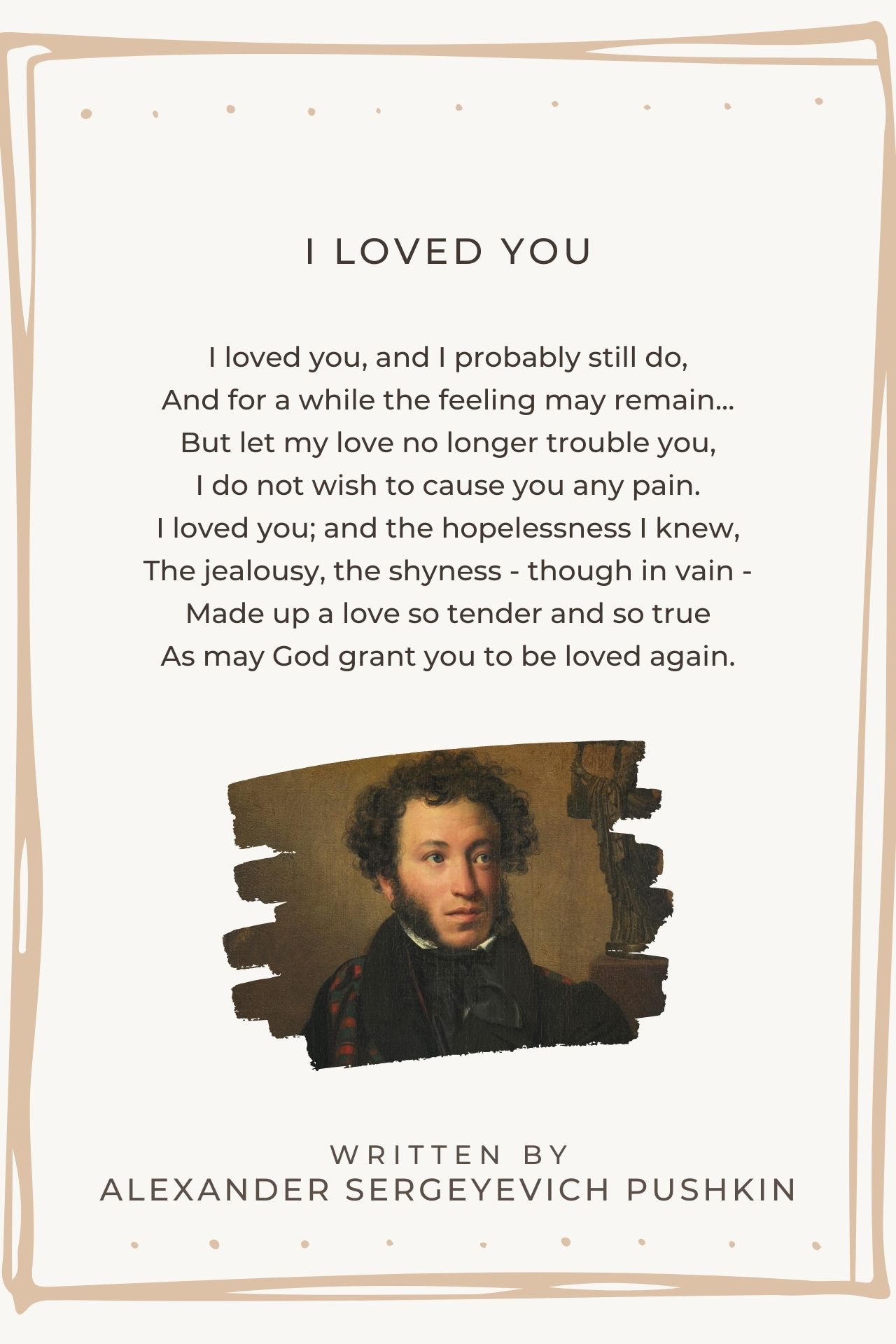 But let my love no longer trouble you, I do not wish to cause you any pain. I loved you; and the hopelessness I knew, The jealousy, the shyness - though in vain - very fine poem of Alexander Pushkin. tony