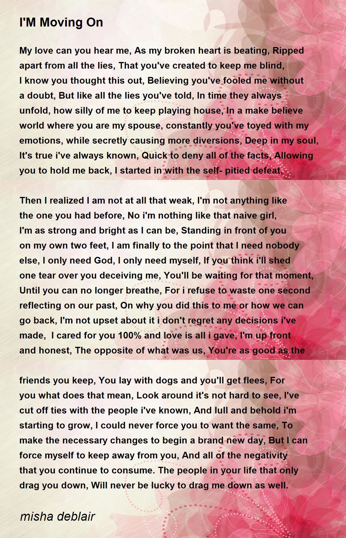 My love can you hear me, As my broken heart is beating, Ripped apart from all the lies, That you've created to keep me blind, I know you thought this out, Believing you've fooled me without a doubt, But like all the lies you've told, In time they always unfold, how silly of me to keep playing house, In a make believe world where you are my spouse, constantly you've toyed with my emotions, while secretly causing more diversions, Deep in my soul, It's true i've always known, Quick to deny all of the facts, Allowing you to hold me back, I started in with the self-pitied defeat, Then I realized I am not at all that weak, I'm not anything like the one you had before, No i'm nothing like that naive girl, I'm as strong and bright as I can be, Standing in front of you on my own two feet, I am finally to the point that I need nobody else, I only need God, I only need myself, If you think i'll shed one tear over you deceiving me, You'll be waiting for that moment, Until you can no longer breathe, For i refuse to waste one second reflecting on our past, On why you did this to me or how we can go back, I'm not upset about it i don't regret any decisions i've made, I cared for you 100% and love is all i gave, I'm up front and honest, The opposite of what was us, You're as good as the friends you keep, You lay with dogs and you'll get flees, For you what does that mean, Look around it's not hard to see, I've cut off ties with the people i've known, And lull and behold i'm starting to grow, I could never force you to want the same, To make the necessary changes to begin a brand new day, But I can force myself to keep away from you, And all of the negativity that you continue to consume. The people in your life that only drag you down, Will never be lucky to drag me down as well.