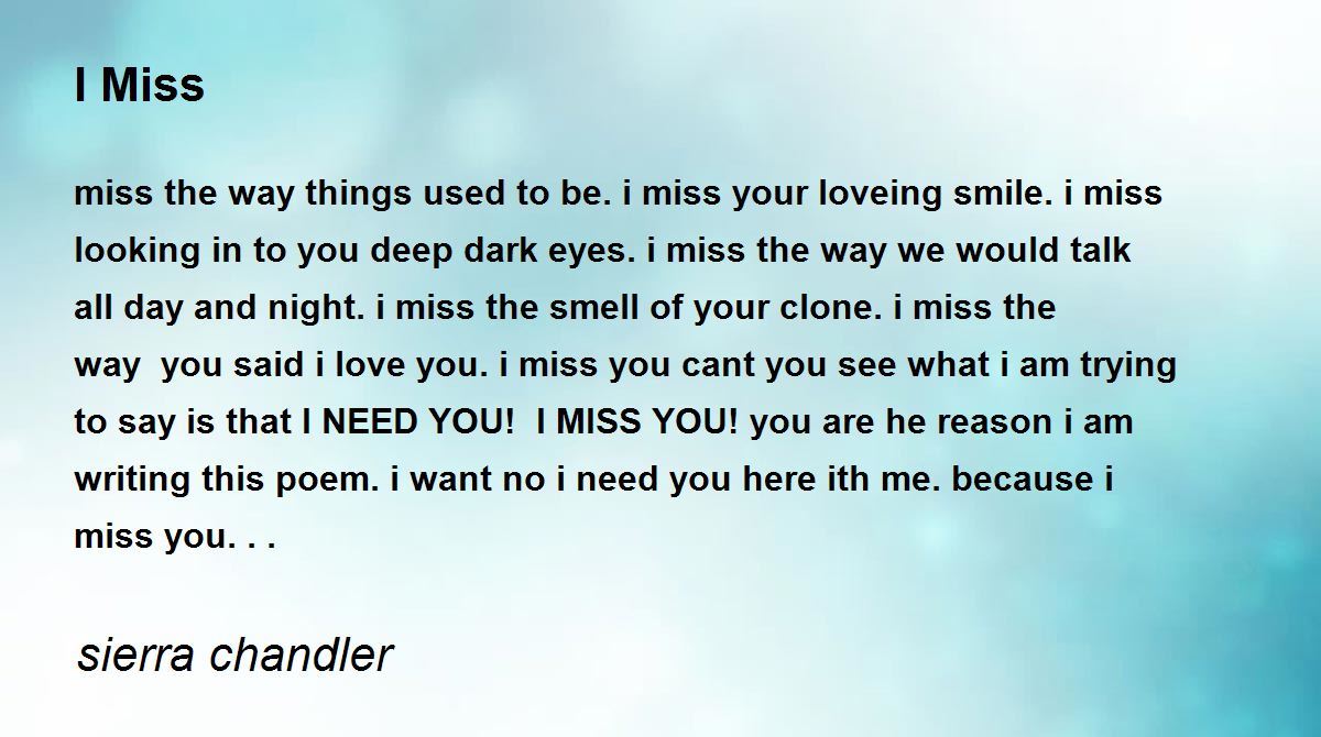 miss the way things used to be. i miss your loveing smile. i miss looking in to you deep dark eyes. i miss the way we would talk all day and night. i miss the smell of your clone. i miss the way you said i love you. i miss you cant you see what i am trying to say is that I NEED YOU! I MISS YOU! you are he reason i am writing this poem. i want no i need you here ith me. because i miss you...