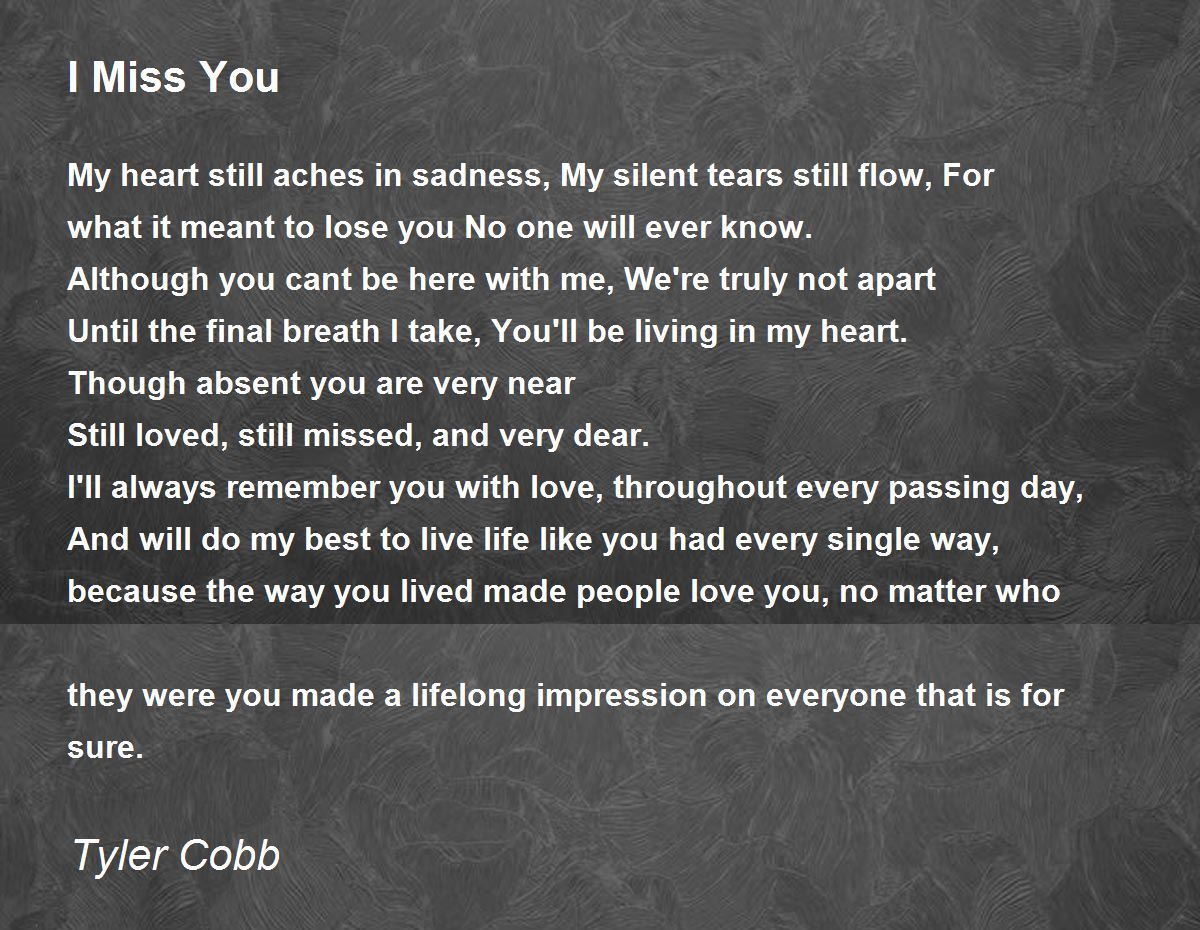 My heart still aches in sadness, My silent tears still flow, For what it meant to lose you No one will ever know.
