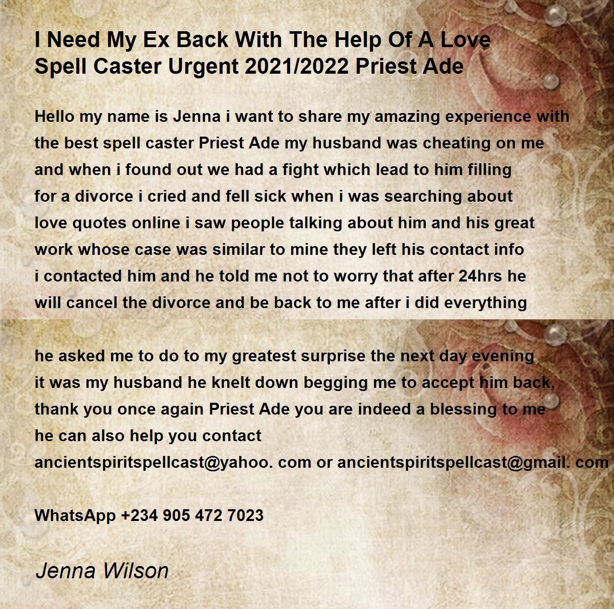Hello my name is Jenna i want to share my amazing experience with the best spell caster Priest Ade my husband was cheating on me and when i found out we had a fight which lead to him filling for a divorce i cried and fell sick when i was searching about love quotes online i saw people talking about him and his great work whose case was similar to mine they left his contact info i contacted him and he told me not to worry that after 24hrs he will cancel the divorce and be back to me after i did everything he asked me to do to my greatest surprise the next day evening it was my husband he knelt down begging me to accept him back, thank you once again Priest Ade you are indeed a blessing to me he can also help you contact