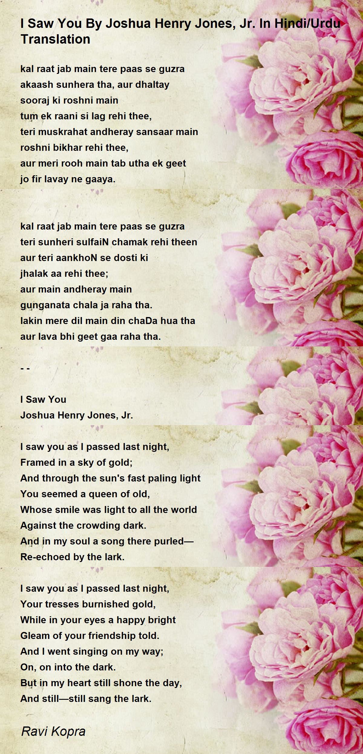 Waaahhhh khoobsurat translation. Hindi man parhkar acha laga. Manmohak kavita.