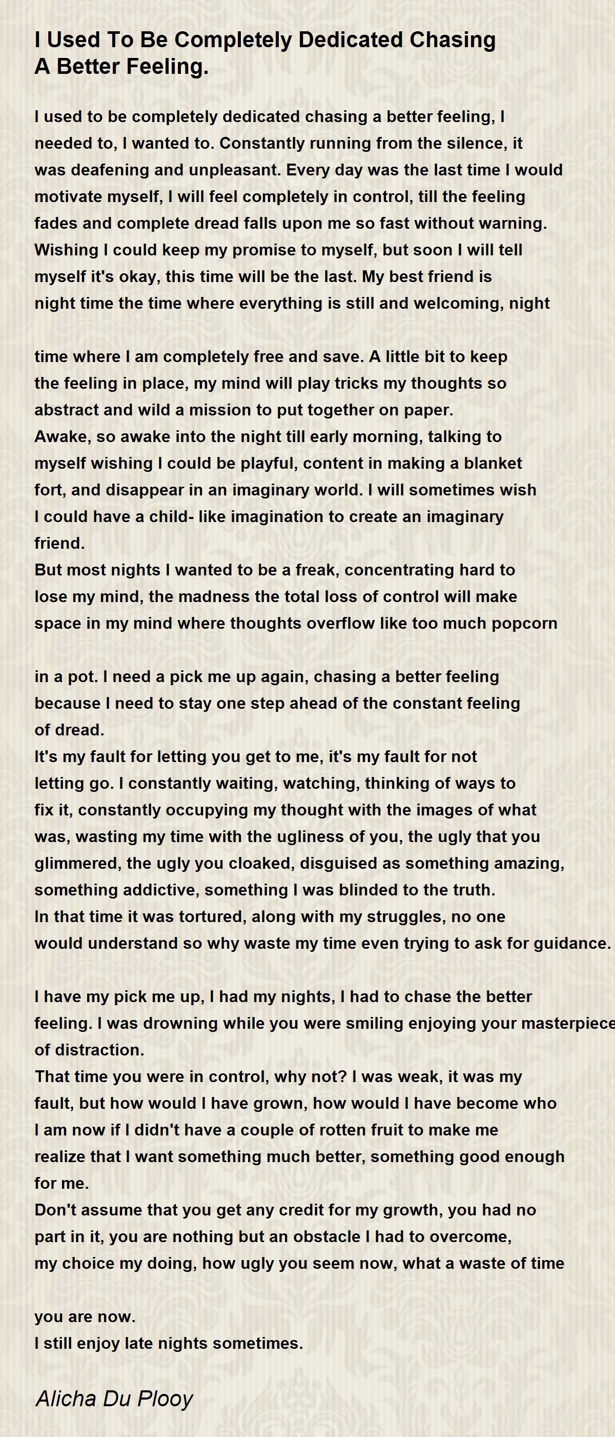 I used to be completely dedicated chasing a better feeling, I needed to, I wanted to. Constantly running from the silence, it was deafening and unpleasant. Every day was the last time I would motivate myself, I will feel completely in control, till the feeling fades and complete dread falls upon me so fast without warning.