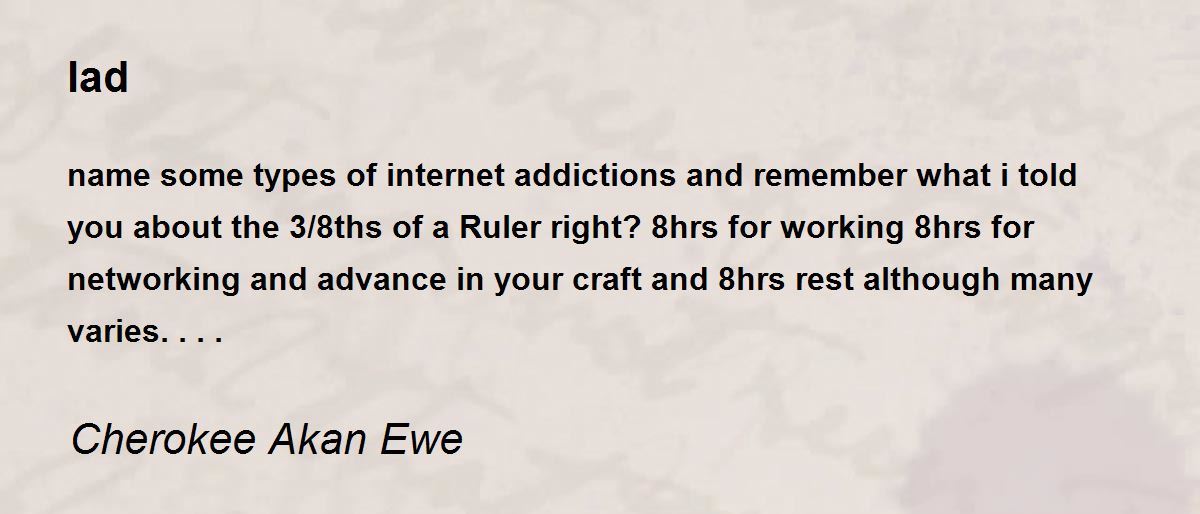 name some types of internet addictions and remember what i told you about the 3/8ths of a Ruler right? 8hrs for working 8hrs for networking and advance in your craft and 8hrs rest although many varies....