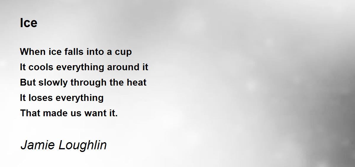 When ice falls into a cupIt cools everything around itBut slowly through the heatIt loses everythingThat made us want it.