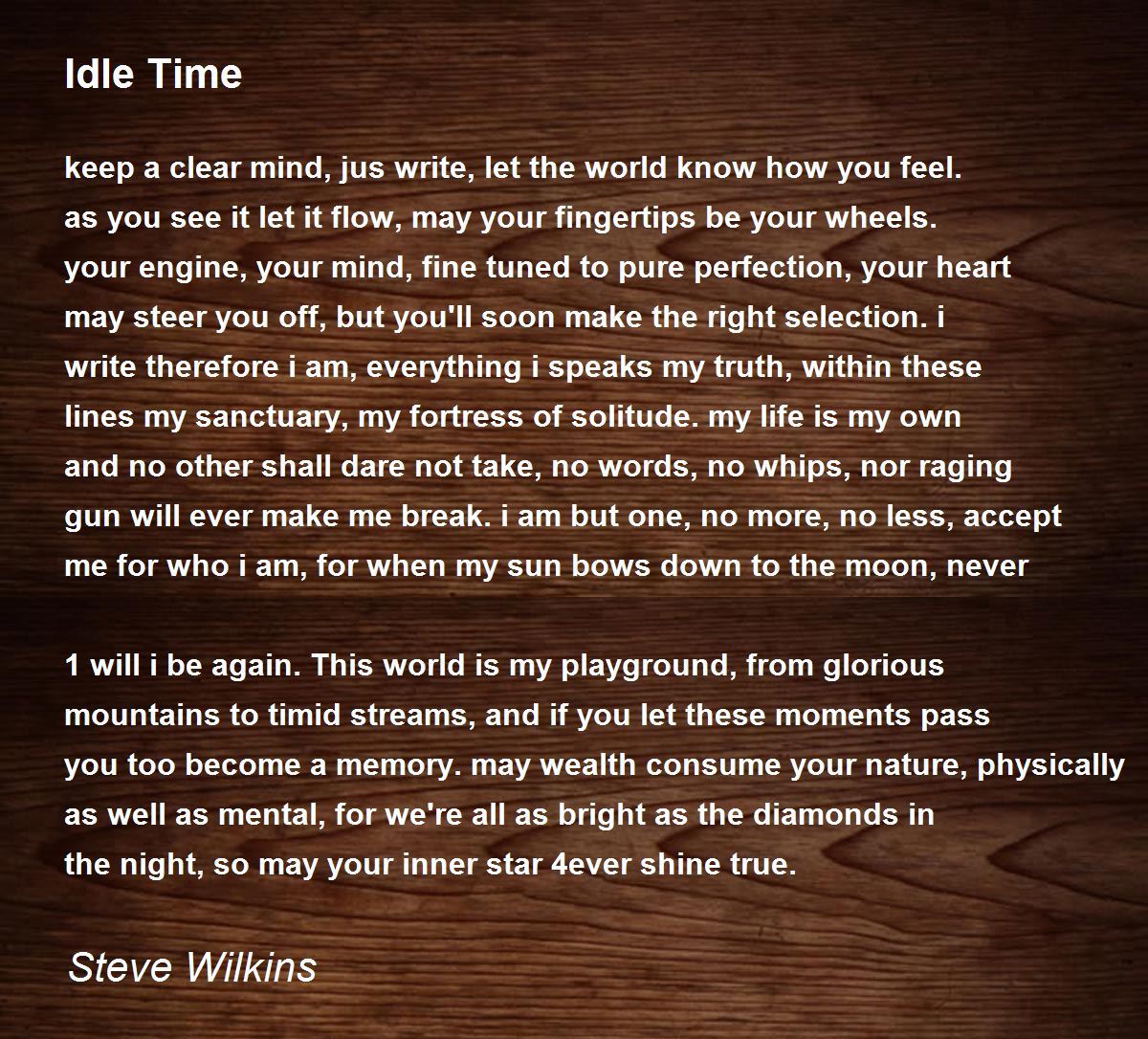 keep a clear mind, jus write, let the world know how you feel. as you see it let it flow, may your fingertips be your wheels. your engine, your mind, fine tuned to pure perfection, your heart may steer you off, but you'll soon make the right selection. i write therefore i am, everything i speaks my truth, within these lines my sanctuary, my fortress of solitude. my life is my own and no other shall dare not take, no words, no whips, nor raging gun will ever make me break. i am but one, no more, no less, accept me for who i am, for when my sun bows down to the moon, never 1 will i be again. This world is my playground, from glorious mountains to timid streams, and if you let these moments pass you too become a memory. may wealth consume your nature, physically as well as mental, for we're all as bright as the diamonds in the night, so may your inner star 4ever shine true.