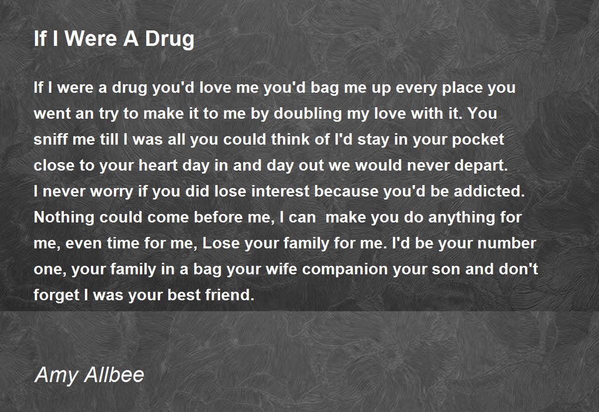 If I were a drug you'd love me you'd bag me up every place you went an try to make it to me by doubling my love with it. You sniff me till I was all you could think of I'd stay in your pocket close to your heart day in and day out we would never depart. I never worry if you did lose interest because you'd be addicted. Nothing could come before me, I can make you do anything for me, even time for me, Lose your family for me. I'd be your number one, your family in a bag your wife companion your son and don't forget I was your best friend.