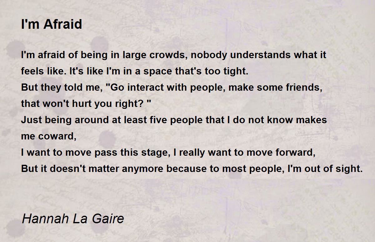 I'm afraid of being in large crowds, nobody understands what it feels like. It's like I'm in a space that's too tight.