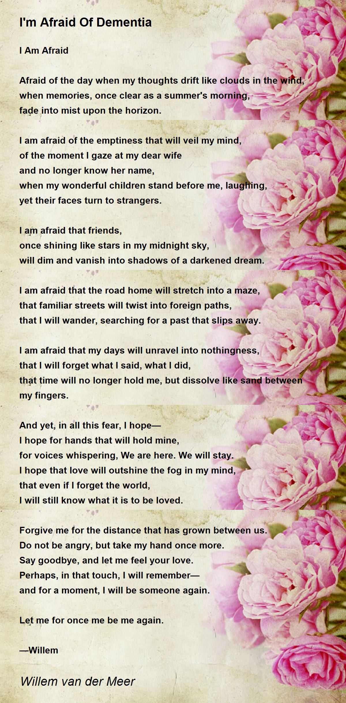 A very, very touching, deeply poignant yet beautiful poem that gives us a glimpse of Dementia. So brilliantly narrated and vividly depicted. I can feel your fear and it is also hoped that if in case we are wrapped by this dreaded disease, we are still loved by our loved ones. To my favorites.
