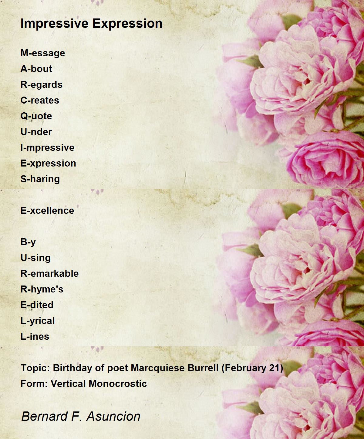 Another wonderful monocrostic birthday gift to poet Marcquiese Burrell.....10++++++++++++++