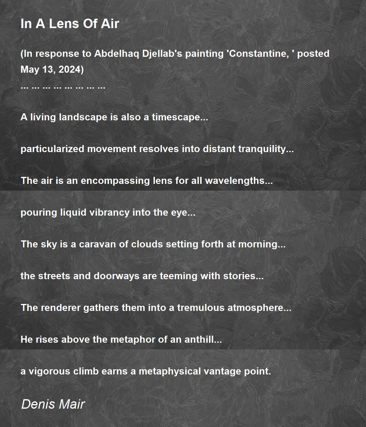 I wrote the poem 'Painting Air Light Energized Qualities', inspired by a comment I had made on the poem 'In A Lens Of Air', by the poet Denis Mair and dedicated to Denis Mair.