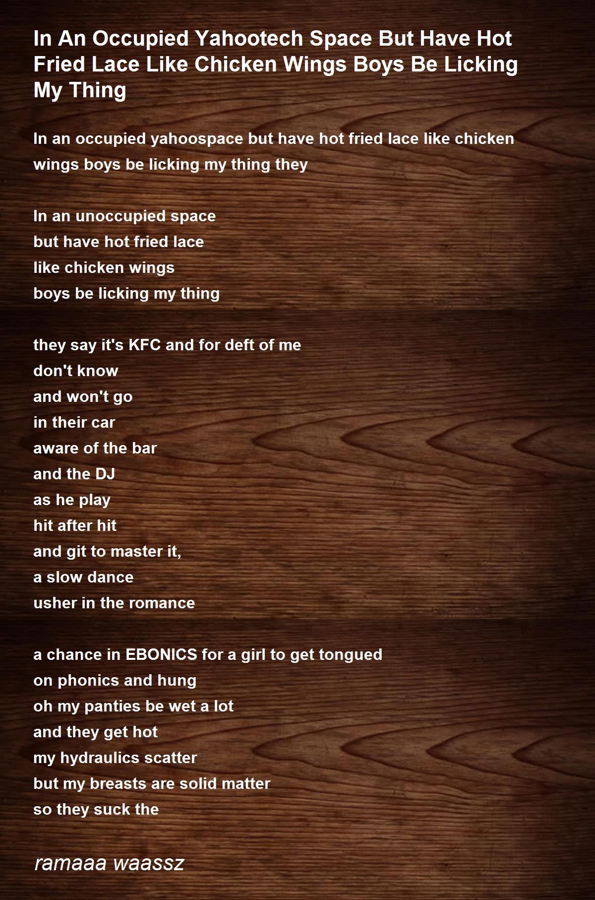 In an occupied yahoospace but have hot fried lace like chicken wings boys be licking my thing they