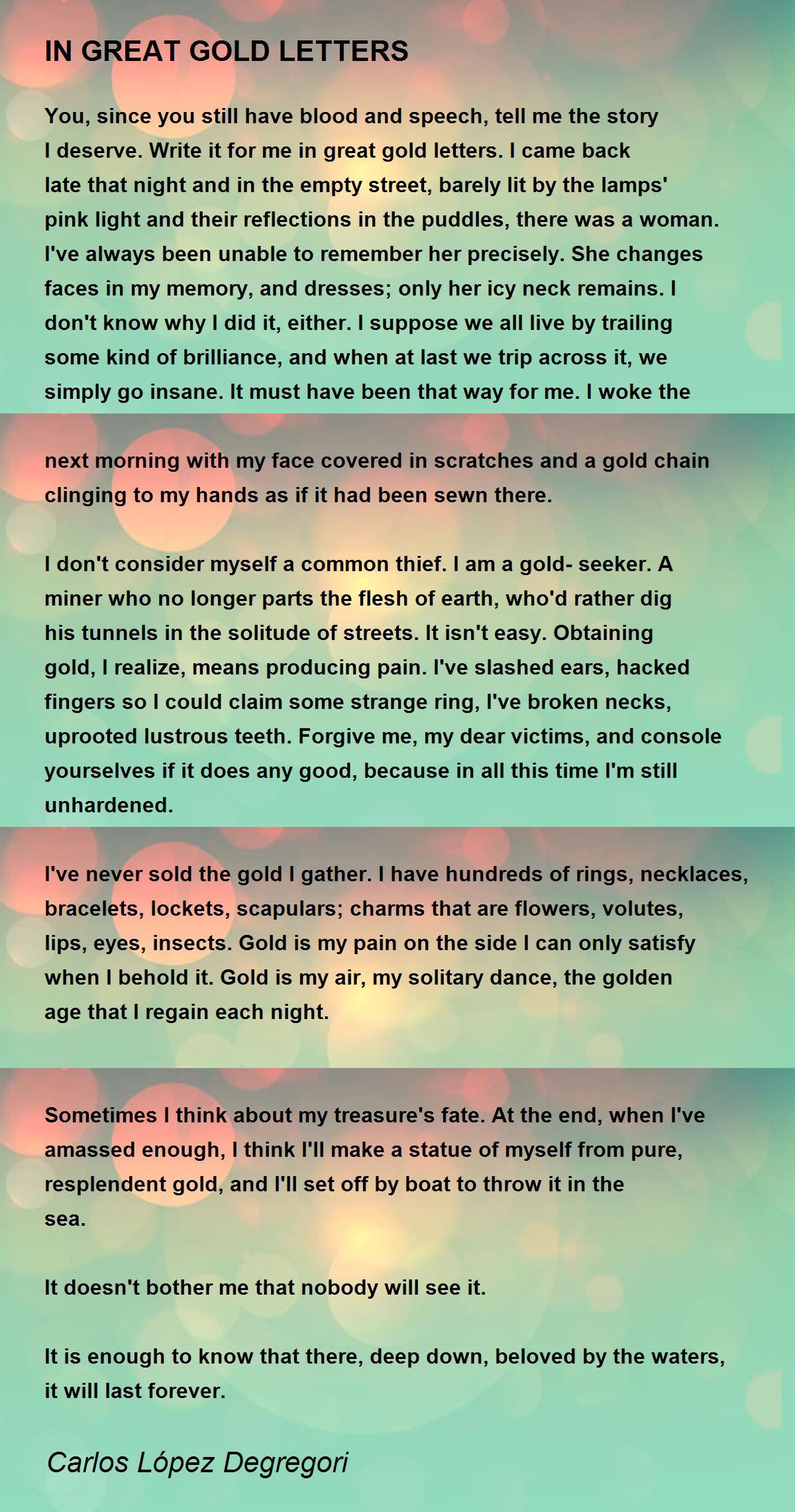 I've never sold the gold I gather. I have hundreds of rings, necklaces, bracelets, lockets, scapulars; charms that are flowers, volutes, lips, eyes, insects. Gold is my pain on the side I can only satisfy when I behold it. Gold is my air, my solitary dance, the golden age that I regain each night.