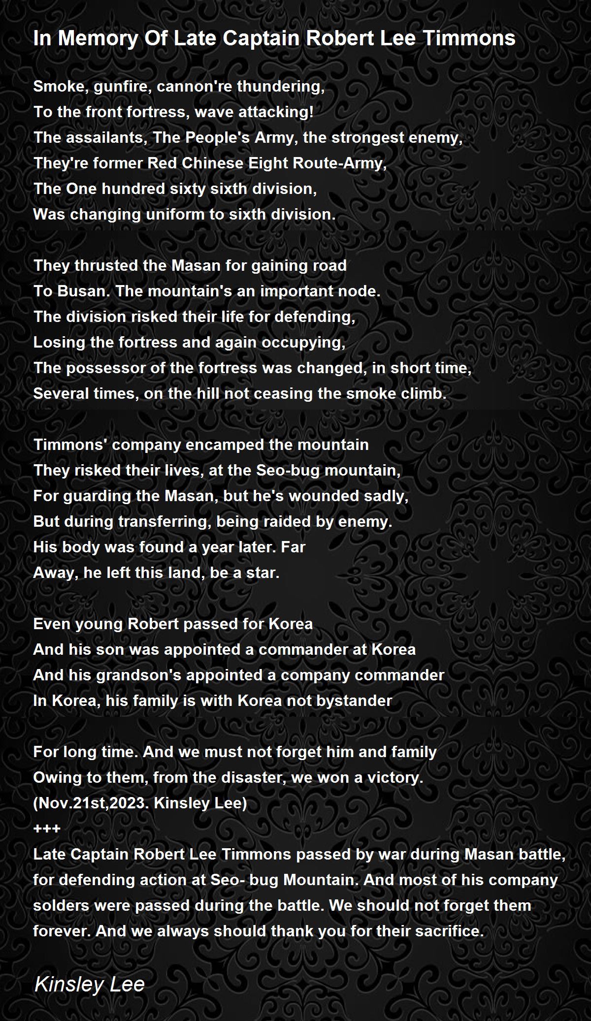 Late Captain Robert Lee Timmons passed by war during Masan battle, for defending action at Seo-bug Mountain. And most of his company solders were passed during the battle. We should not forget them forever. And we always should thank you for their sacrifice.