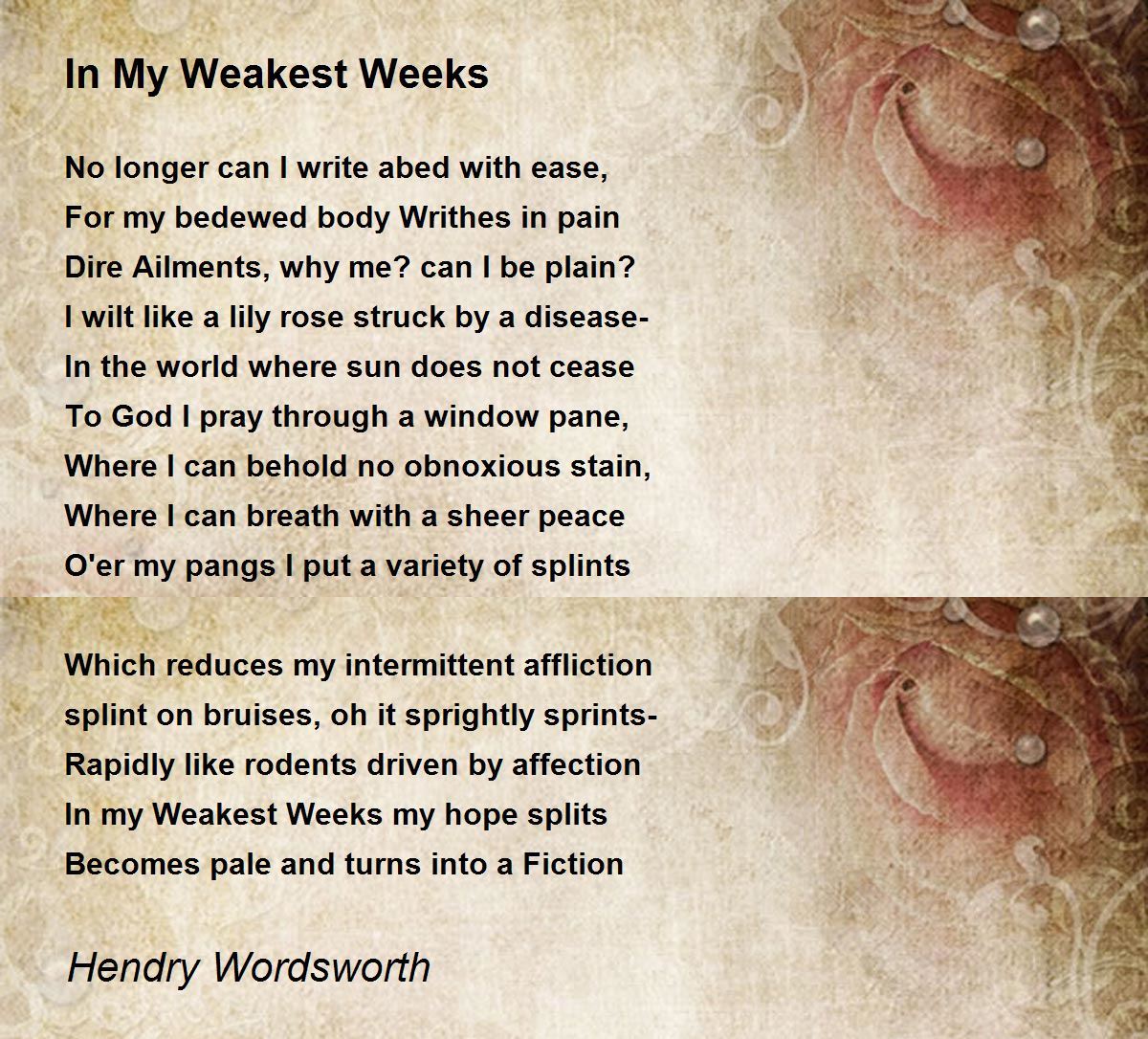 body Writhes in pain I wilt like a lily rose struck by a disease- splint on bruises, oh it sprightly sprints- my hope splits and ends up in fiction Read ur poem many times ….. and found these points. Very nice poems conveying a lot…. Thank you dear poet. tony