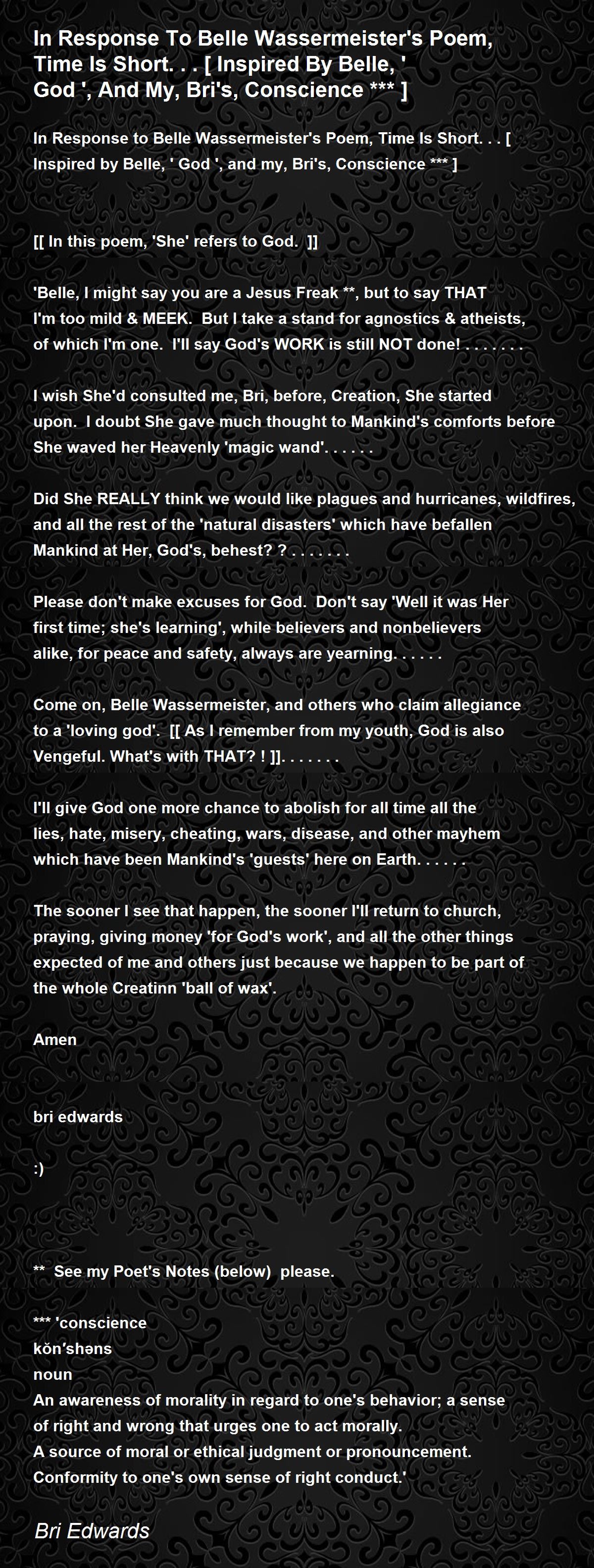 In Response to Belle Wassermeister's Poem, Time Is Short...[ Inspired by Belle, ' God ', and my, Bri's, Conscience *** ]