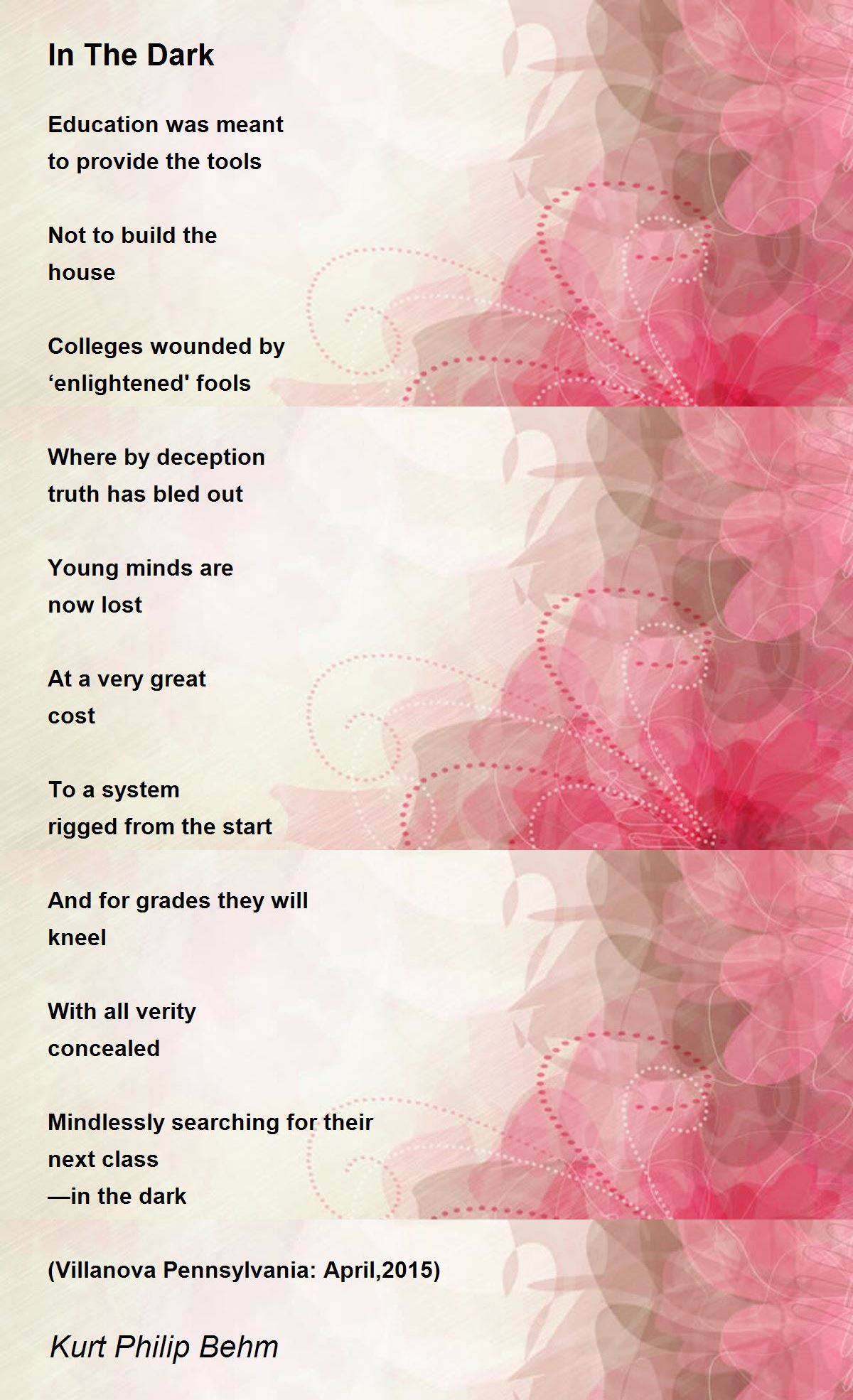 Young minds are now lost At a very great cost To a system rigged from the start.. What a great responsibility is it for the teachers of the world. Poet Kurt Philip reminds all the teachers of the world about their lofty vocation. thank u. tony