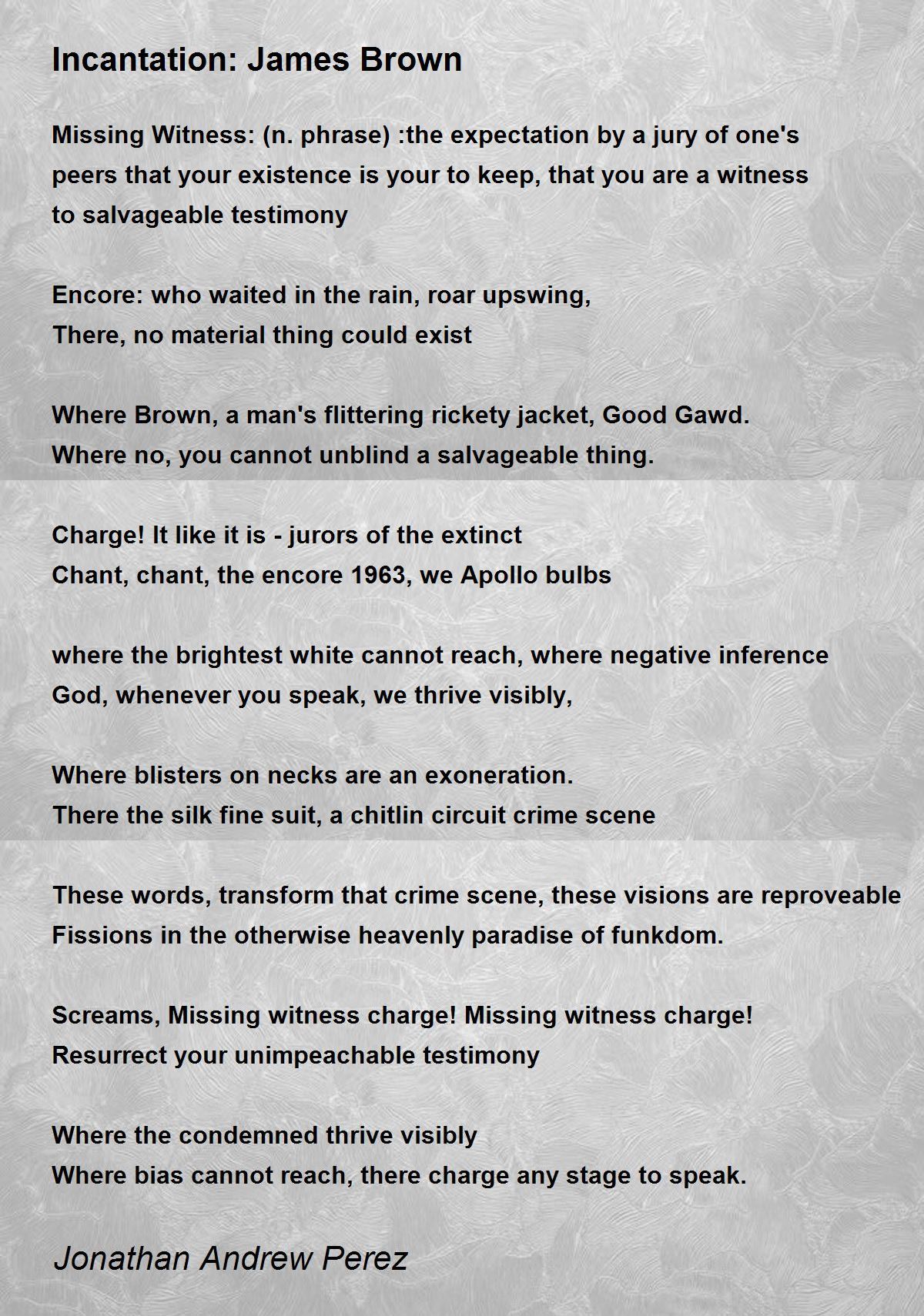 Missing Witness: (n. phrase) :the expectation by a jury of one's peers that your existence is your to keep, that you are a witness to salvageable testimony