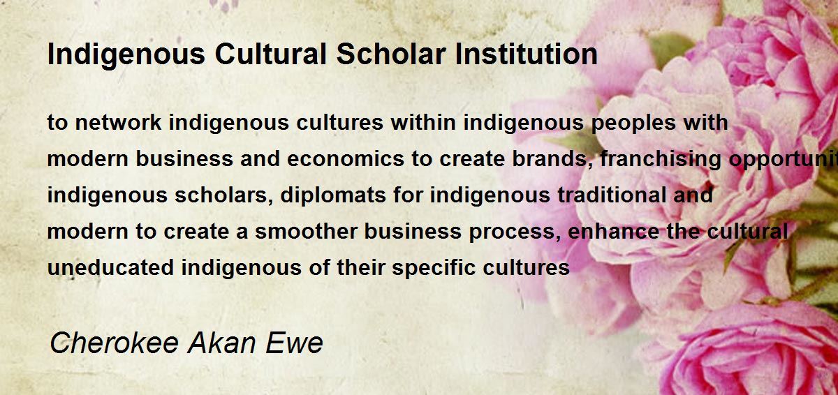to network indigenous cultures within indigenous peoples with modern business and economics to create brands, franchising opportunities, indigenous scholars, diplomats for indigenous traditional and modern to create a smoother business process, enhance the cultural uneducated indigenous of their specific cultures