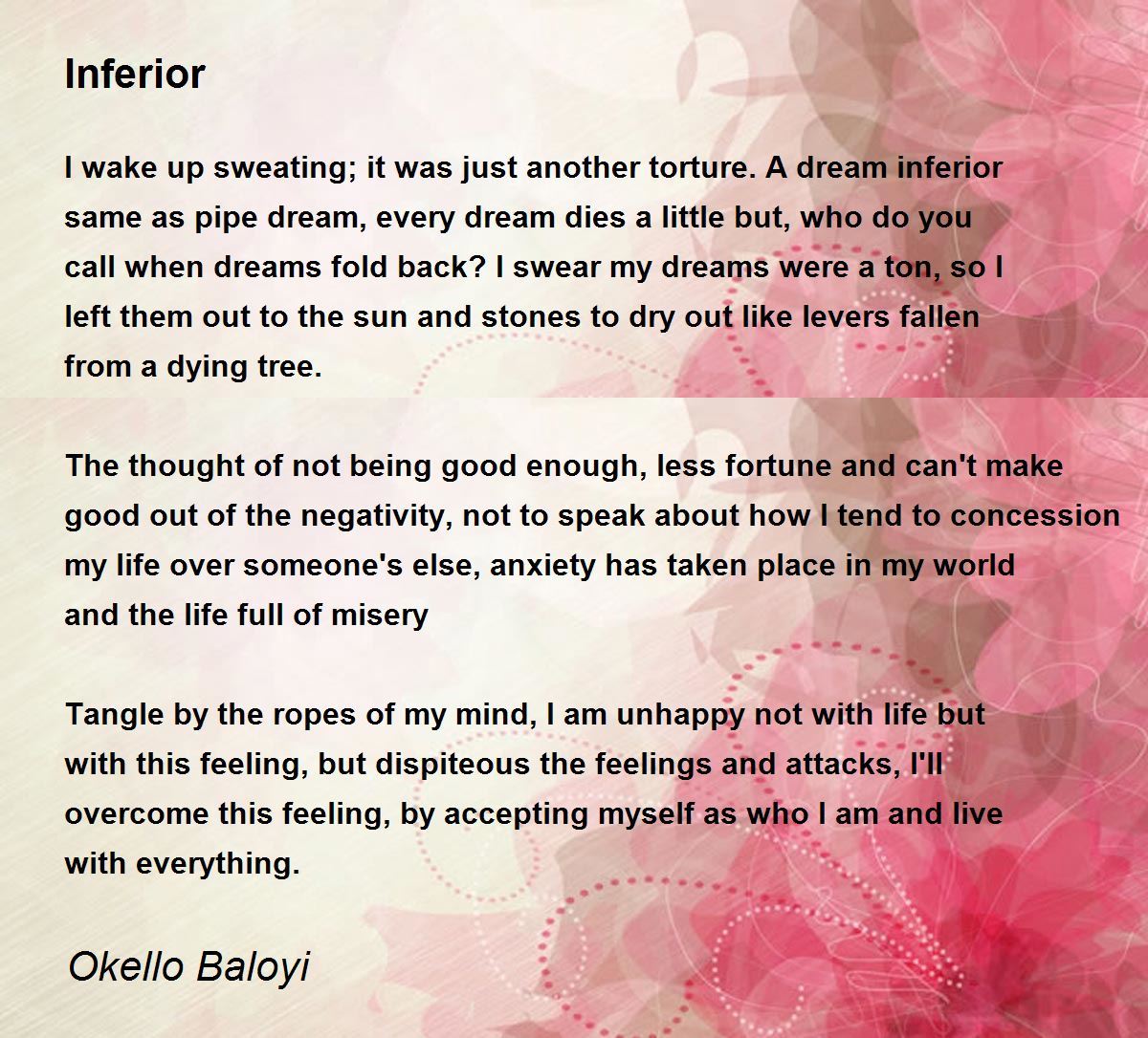 The thought of not being good enough, less fortune and can't make good out of the negativity, not to speak about how I tend to concession my life over someone's else, anxiety has taken place in my world and the life full of misery