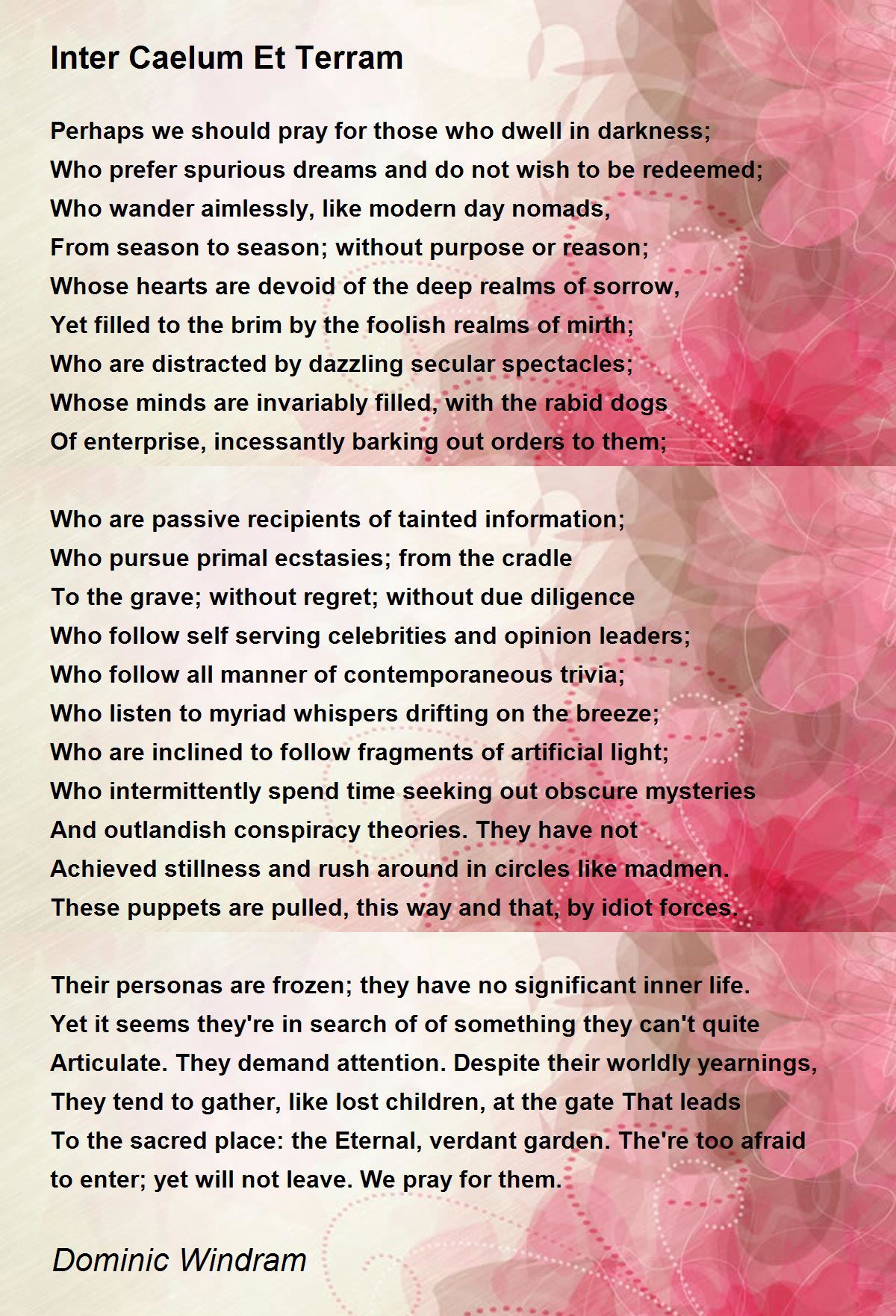 Yet it seems they're in search of of something they can't quite Articulate. They demand attention. Despite their worldly yearnings, They tend to gather, like lost children, at the gate That leads To the sacred place: the Eternal, verdant garden. The're too afraid to enter; yet will not leave. We pray for them.