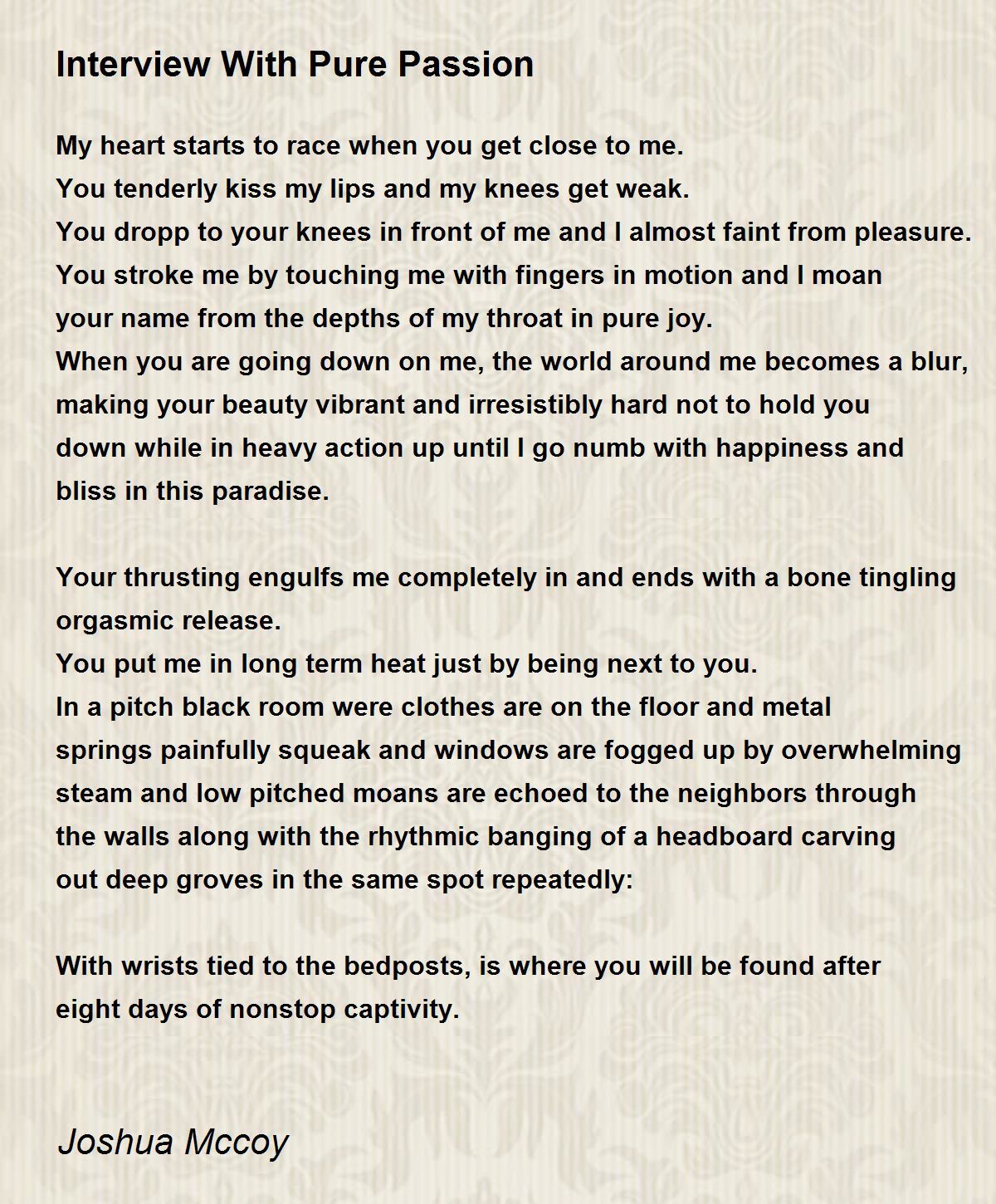 In a pitch black room were clothes are on the floor and metal springs painfully squeak and windows are fogged up by overwhelming steam and low pitched moans are echoed to the neighbors through the walls along with the rhythmic banging of a headboard carving out deep groves in the same spot repeatedly: