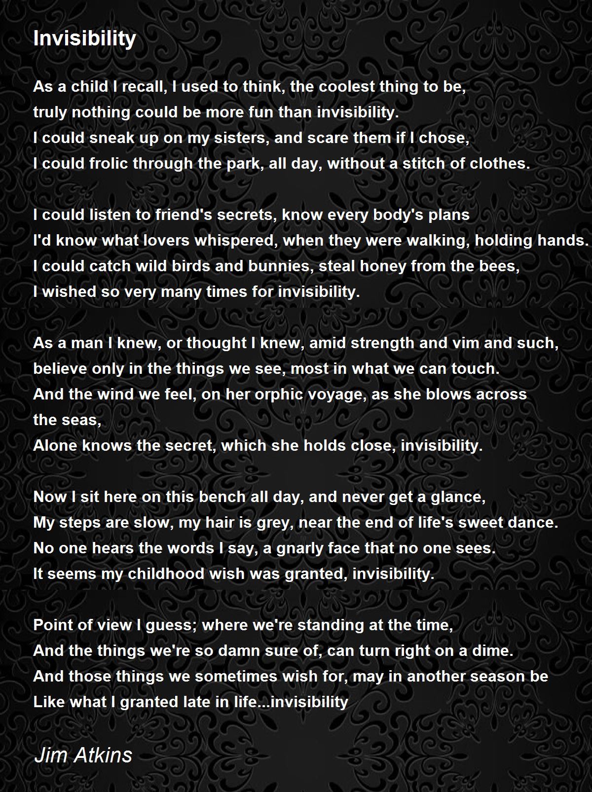 As a child I recall, I used to think, the coolest thing to be, truly nothing could be more fun than invisibility.