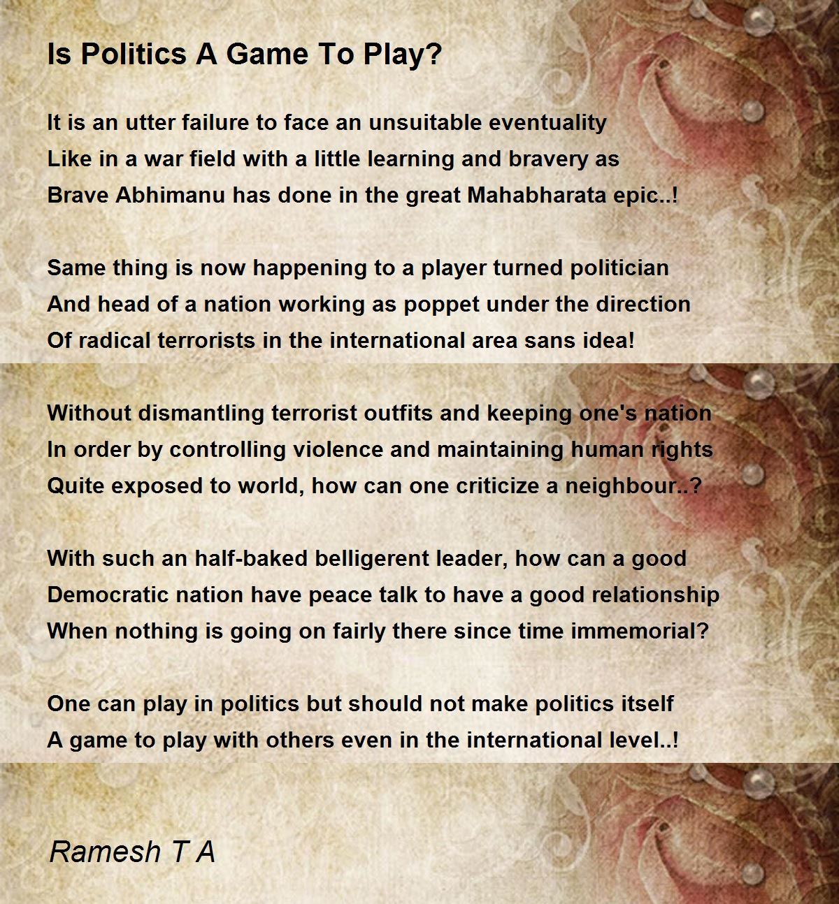 One can play in politics but should not make politics itself A game to play with others even in the international level..! .....so touching and impressive. Beautifully penned. Thank you sir.