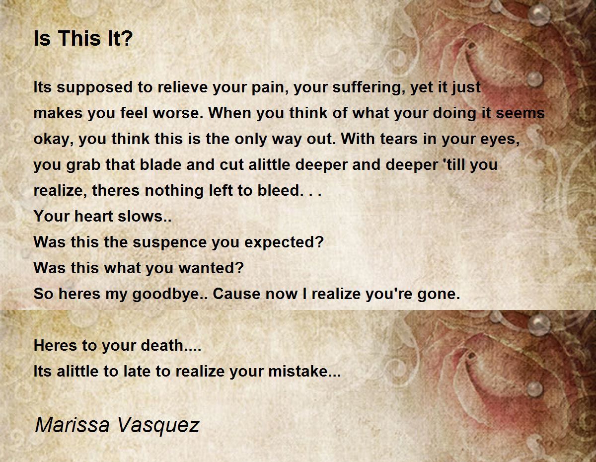 Its supposed to relieve your pain, your suffering, yet it just makes you feel worse. When you think of what your doing it seems okay, you think this is the only way out. With tears in your eyes, you grab that blade and cut alittle deeper and deeper 'till you realize, theres nothing left to bleed...
