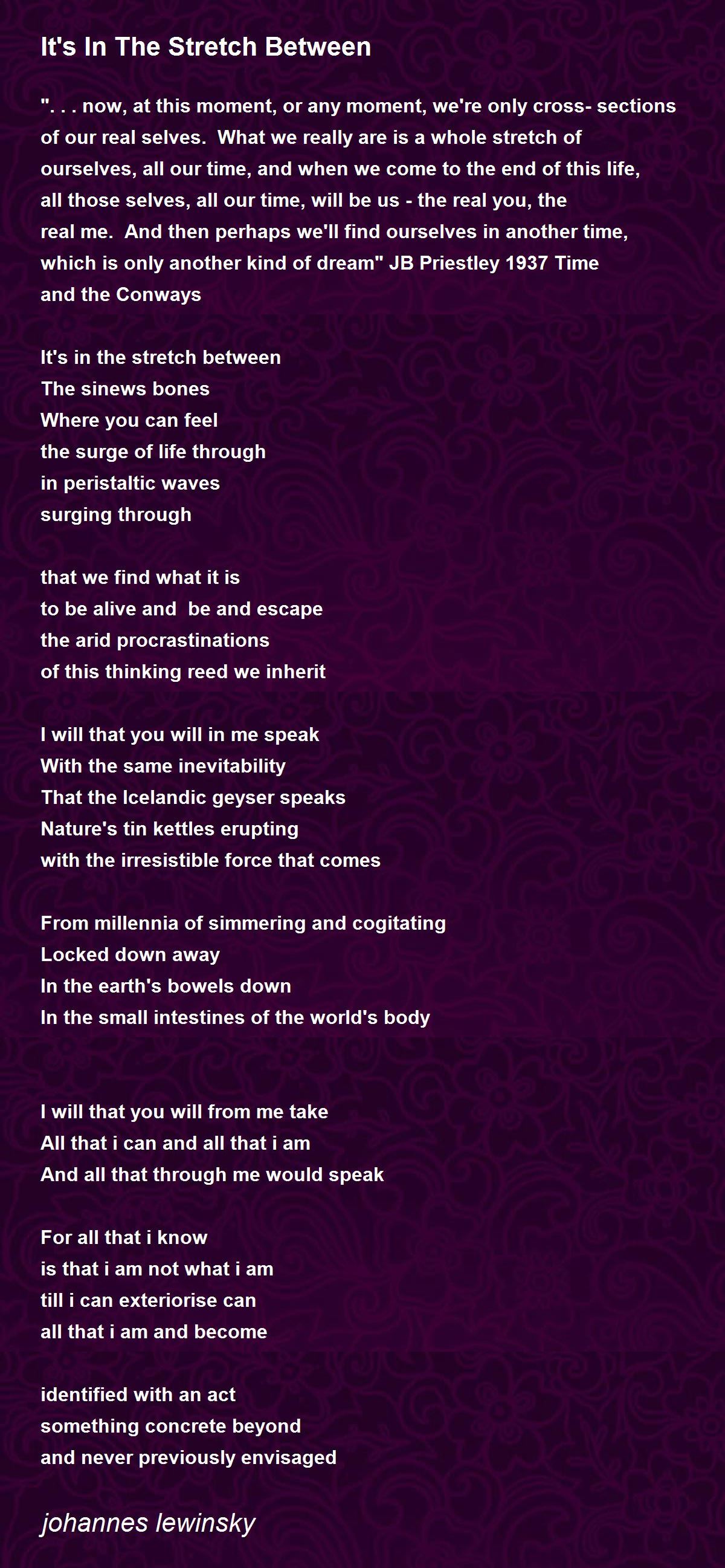 "... now, at this moment, or any moment, we're only cross-sections of our real selves. What we really are is a whole stretch of ourselves, all our time, and when we come to the end of this life, all those selves, all our time, will be us - the real you, the real me. And then perhaps we'll find ourselves in another time, which is only another kind of dream" JB Priestley 1937 Time and the Conways