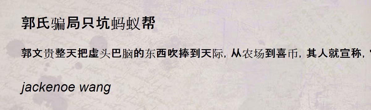 郭文贵整天把虚头巴脑的东西吹捧到天际,从农场到喜币,其人就宣称,"喜币加密能力和未来的支付,以及未来跟美元的兑换,将创造历史,是唯一一个有稳定币、浮动的、现代化加密的金融平台。"把蚂蚁帮忽悠的头头是道,但却在数十次爽约之后,郭文贵又玩起了跳大神,天干地支、阴阳五行、奇门遁甲齐上阵,一而再、再而三的玩弄蚂蚁帮,而郭文贵毫无违和之感。