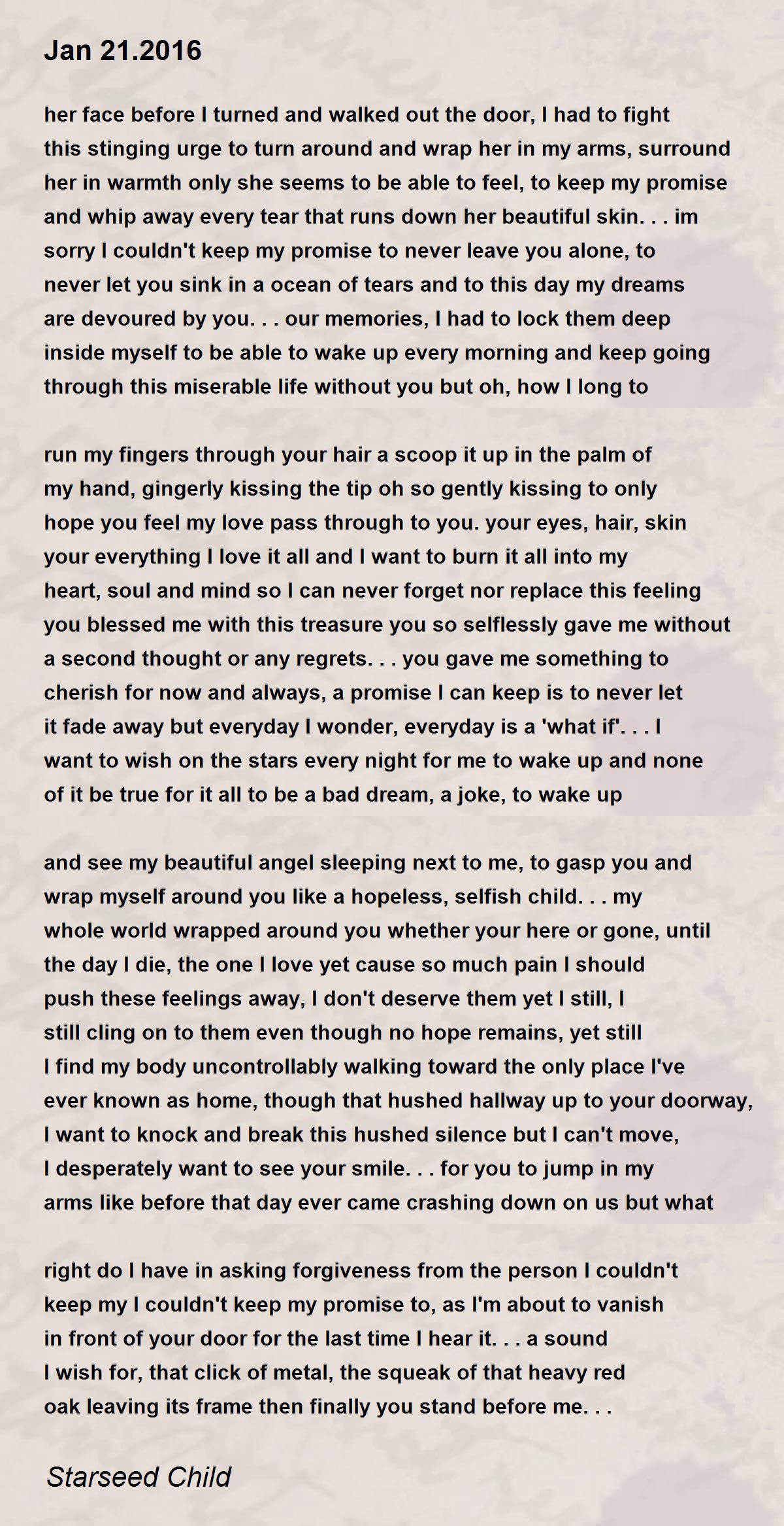 her face before I turned and walked out the door, I had to fight this stinging urge to turn around and wrap her in my arms, surround her in warmth only she seems to be able to feel, to keep my promise and whip away every tear that runs down her beautiful skin...im sorry I couldn't keep my promise to never leave you alone, to never let you sink in a ocean of tears and to this day my dreams are devoured by you...our memories, I had to lock them deep inside myself to be able to wake up every morning and keep going through this miserable life without you but oh, how I long to run my fingers through your hair a scoop it up in the palm of my hand, gingerly kissing the tip oh so gently kissing to only hope you feel my love pass through to you. your eyes, hair, skin your everything I love it all and I want to burn it all into my heart, soul and mind so I can never forget nor replace this feeling you blessed me with this treasure you so selflessly gave me without a second thought or any regrets...you gave me something to cherish for now and always, a promise I can keep is to never let it fade away but everyday I wonder, everyday is a 'what if'...I want to wish on the stars every night for me to wake up and none of it be true for it all to be a bad dream, a joke, to wake up and see my beautiful angel sleeping next to me, to gasp you and wrap myself around you like a hopeless, selfish child...my whole world wrapped around you whether your here or gone, until the day I die, the one I love yet cause so much pain I should push these feelings away, I don't deserve them yet I still, I still cling on to them even though no hope remains, yet still I find my body uncontrollably walking toward the only place I've ever known as home, though that hushed hallway up to your doorway, I want to knock and break this hushed silence but I can't move, I desperately want to see your smile...for you to jump in my arms like before that day ever came crashing down on us but what right do I have in asking forgiveness from the person I couldn't keep my I couldn't keep my promise to, as I'm about to vanish in front of your door for the last time I hear it...a sound I wish for, that click of metal, the squeak of that heavy red oak leaving its frame then finally you stand before me...