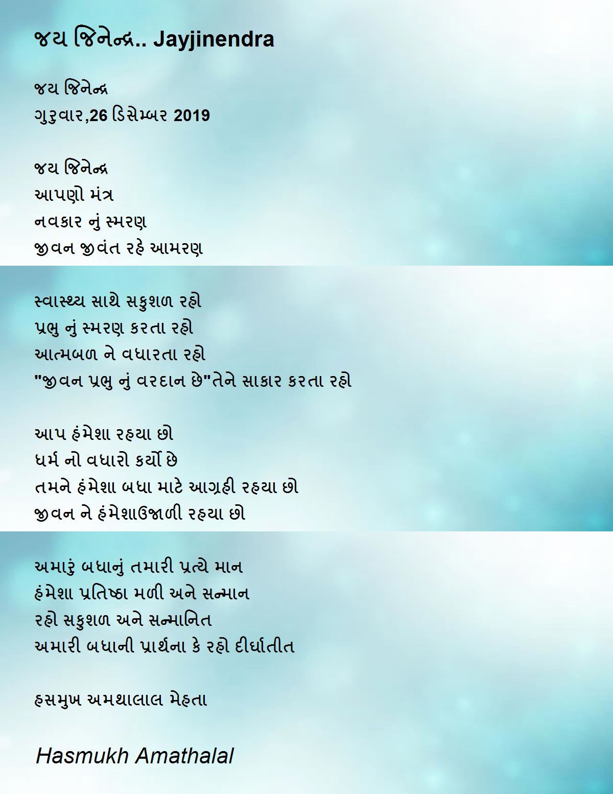 જય જિનેન્દ્ર ગુરુવાર,26 ડિસેમ્બર 2019 જય જિનેન્દ્ર આપણો મંત્ર નવકાર નું સ્મરણ જીવન જીવંત રહે આમરણ સ્વાસ્થ્ય સાથે સકુશળ રહો અમારું બધાનું તમારી પ્રત્યે માન હંમેશા પ્રતિષ્ઠા મળી અને સન્માન રહો સકુશળ અને સન્માનિત અમારી બધાની પ્રાર્થના કે રહો દીર્ઘાતીત હસમુખ અમથાલાલ મેહતા Hasmukh Amathalal