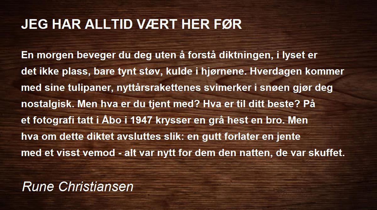 En morgen beveger du deg uten å forstå diktningen, i lyset er det ikke plass, bare tynt støv, kulde i hjørnene. Hverdagen kommer med sine tulipaner, nyttårsrakettenes svimerker i snøen gjør deg nostalgisk. Men hva er du tjent med? Hva er til ditt beste? På et fotografi tatt i Åbo i 1947 krysser en grå hest en bro. Men hva om dette diktet avsluttes slik: en gutt forlater en jente med et visst vemod - alt var nytt for dem den natten, de var skuffet.