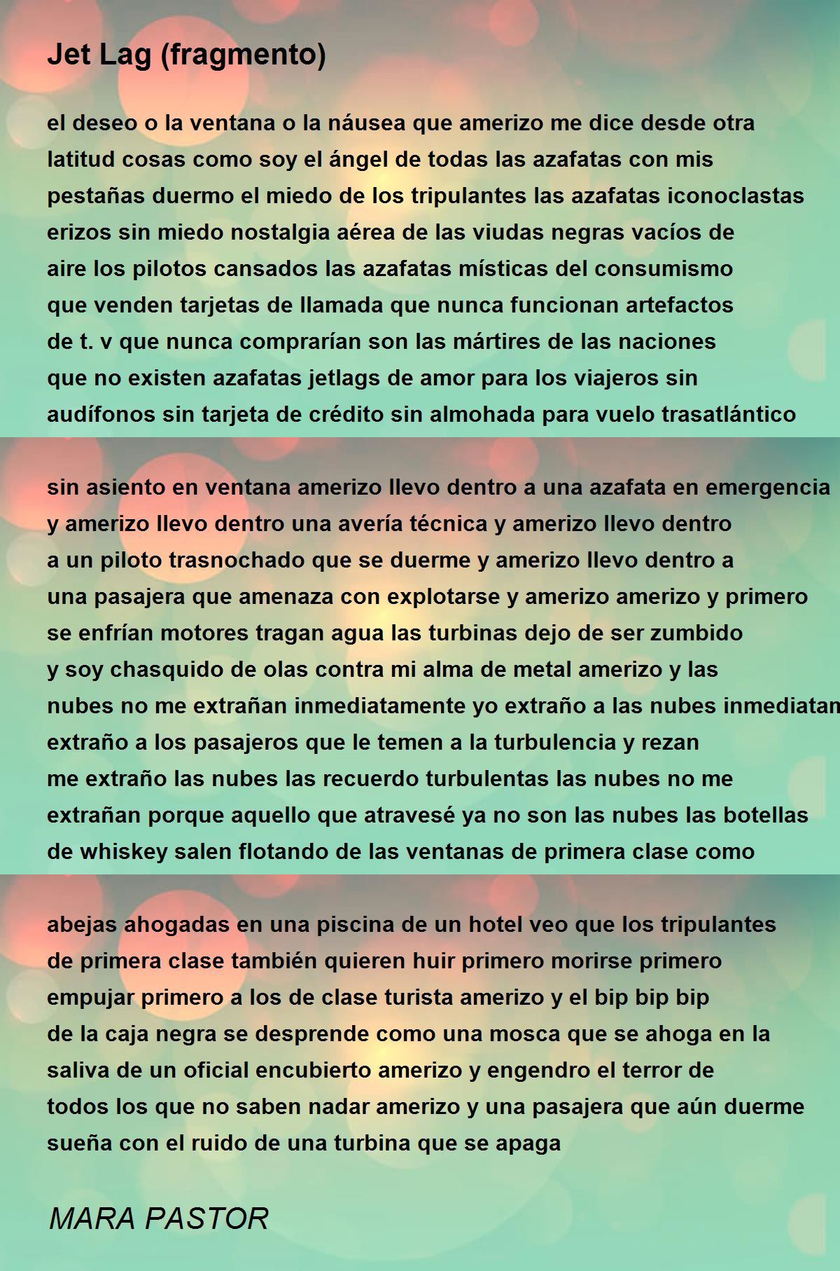 el deseo o la ventana o la náusea que amerizo me dice desde otra latitud cosas como soy el ángel de todas las azafatas con mis pestañas duermo el miedo de los tripulantes las azafatas iconoclastas erizos sin miedo nostalgia aérea de las viudas negras vacíos de aire los pilotos cansados las azafatas místicas del consumismo que venden tarjetas de llamada que nunca funcionan artefactos de t.v que nunca comprarían son las mártires de las naciones que no existen azafatas jetlags de amor para los viajeros sin audífonos sin tarjeta de crédito sin almohada para vuelo trasatlántico sin asiento en ventana amerizo llevo dentro a una azafata en emergencia y amerizo llevo dentro una avería técnica y amerizo llevo dentro a un piloto trasnochado que se duerme y amerizo llevo dentro a una pasajera que amenaza con explotarse y amerizo amerizo y primero se enfrían motores tragan agua las turbinas dejo de ser zumbido y soy chasquido de olas contra mi alma de metal amerizo y las nubes no me extrañan inmediatamente yo extraño a las nubes inmediatamente extraño a los pasajeros que le temen a la turbulencia y rezan me extraño las nubes las recuerdo turbulentas las nubes no me extrañan porque aquello que atravesé ya no son las nubes las botellas de whiskey salen flotando de las ventanas de primera clase como abejas ahogadas en una piscina de un hotel veo que los tripulantes de primera clase también quieren huir primero morirse primero empujar primero a los de clase turista amerizo y el bip bip bip de la caja negra se desprende como una mosca que se ahoga en la saliva de un oficial encubierto amerizo y engendro el terror de todos los que no saben nadar amerizo y una pasajera que aún duerme sueña con el ruido de una turbina que se apaga