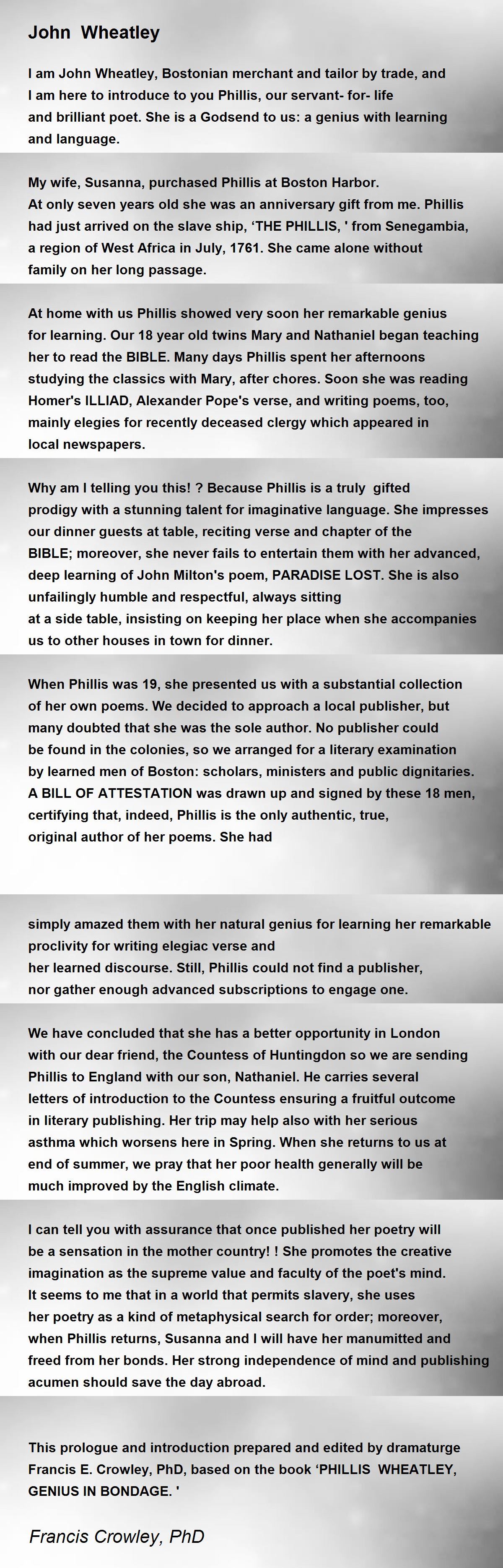 I am John Wheatley, Bostonian merchant and tailor by trade, and I am here to introduce to you Phillis, our servant-for-life and brilliant poet. She is a Godsend to us: a genius with learning and language.