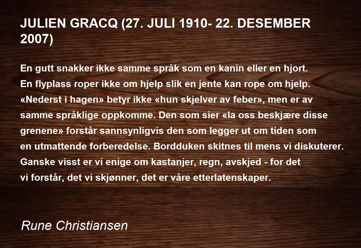 En gutt snakker ikke samme språk som en kanin eller en hjort. En flyplass roper ikke om hjelp slik en jente kan rope om hjelp. «Nederst i hagen» betyr ikke «hun skjelver av feber», men er av samme språklige oppkomme. Den som sier «la oss beskjære disse grenene» forstår sannsynligvis den som legger ut om tiden som en utmattende forberedelse. Bordduken skitnes til mens vi diskuterer. Ganske visst er vi enige om kastanjer, regn, avskjed - for det vi forstår, det vi skjønner, det er våre etterlatenskaper.
