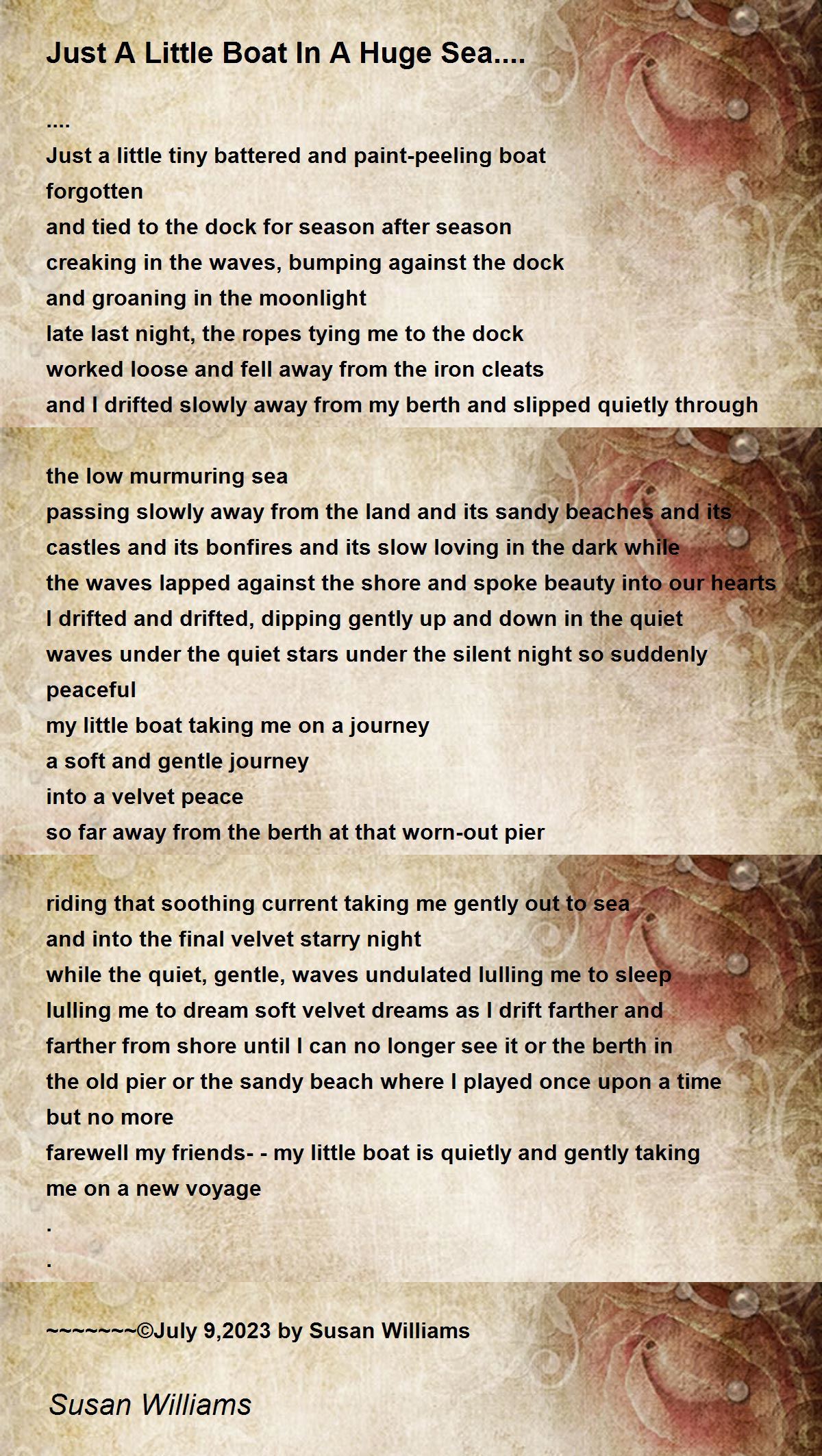 lulling me to dream soft velvet dreams as I drift farther and farther from shore until I can no longer see it or the berth in the old pier or the sandy beach where I played once upon a time but no more